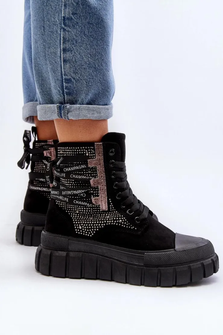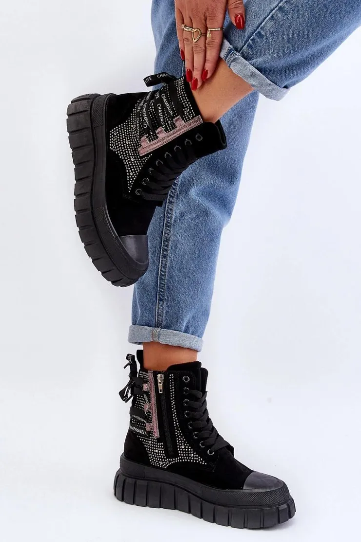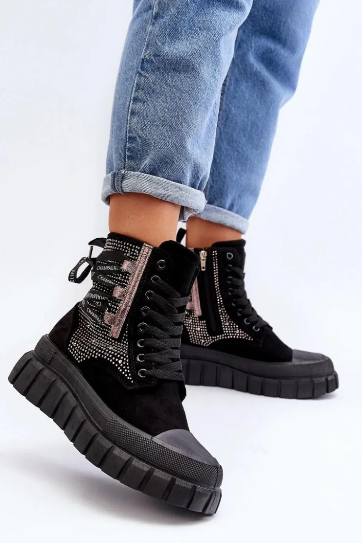 Wysokie trampki damskie wykonane z połączenia eko zamszu i materiału tekstylnego. Ich masywna platforma i podwójne sznurowanie nadają im nowoczesny wygląd, który świetnie komponuje się w różnych stylizacjach. Dodatkowe zapięcie na zamek ułatwi zakładanie obuwia. To absolutny must-have w Twojej garderobie! Przy wyborze rozmiaru prosimy sugerować się tabelą rozmiarów.