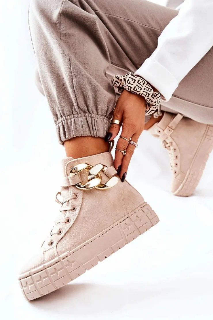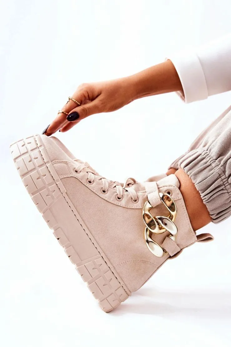 Buty zostały wykonane z zamszowej eko skóry. Wysokie trampki posiadają ozdobny łańcuch na pasku, który jest zapinany na sprzączkę. Można go także całkowicie zdjąć. Buty posiadają wysoką, stabilną platformę. Wśrodku znajduje się materiałowa wkładka. Koniecznie sprawdź także pozostałą naszą ofertę trampek na platformie! Przy wyborze rozmiaru prosimy sugerować się tabelą rozmiarów.