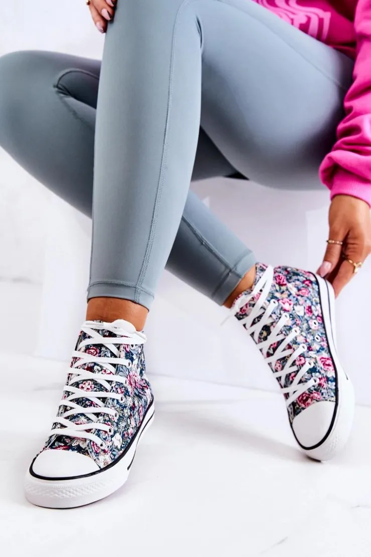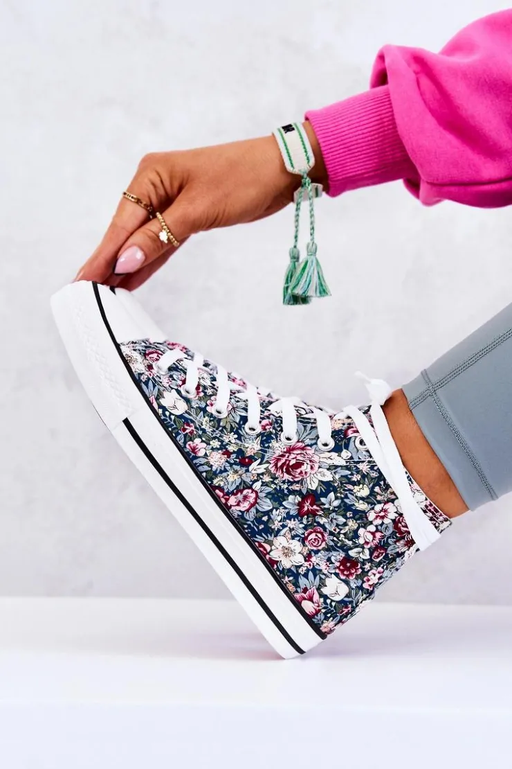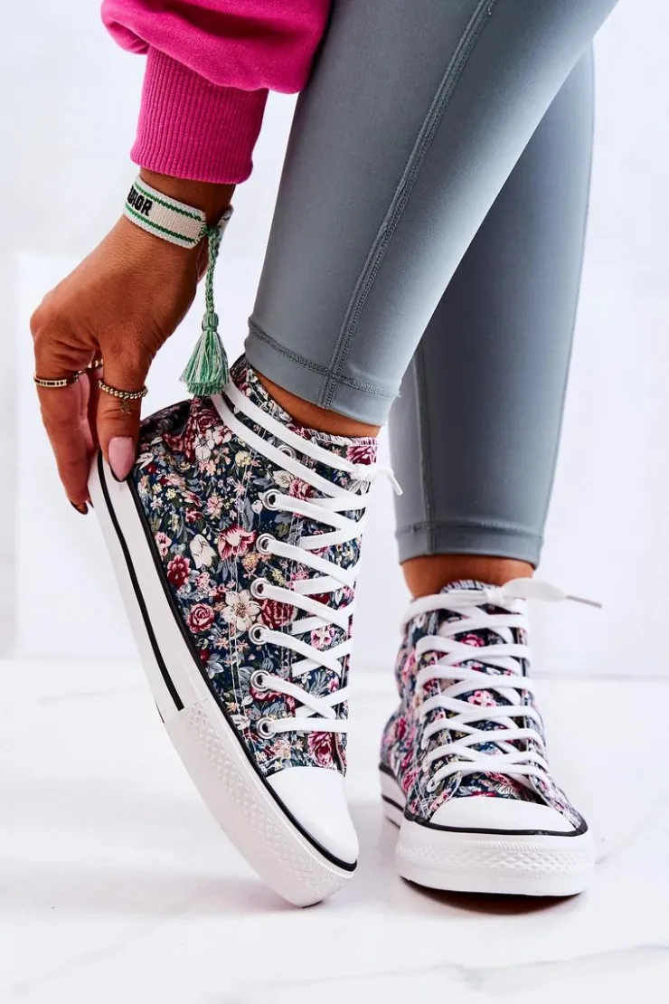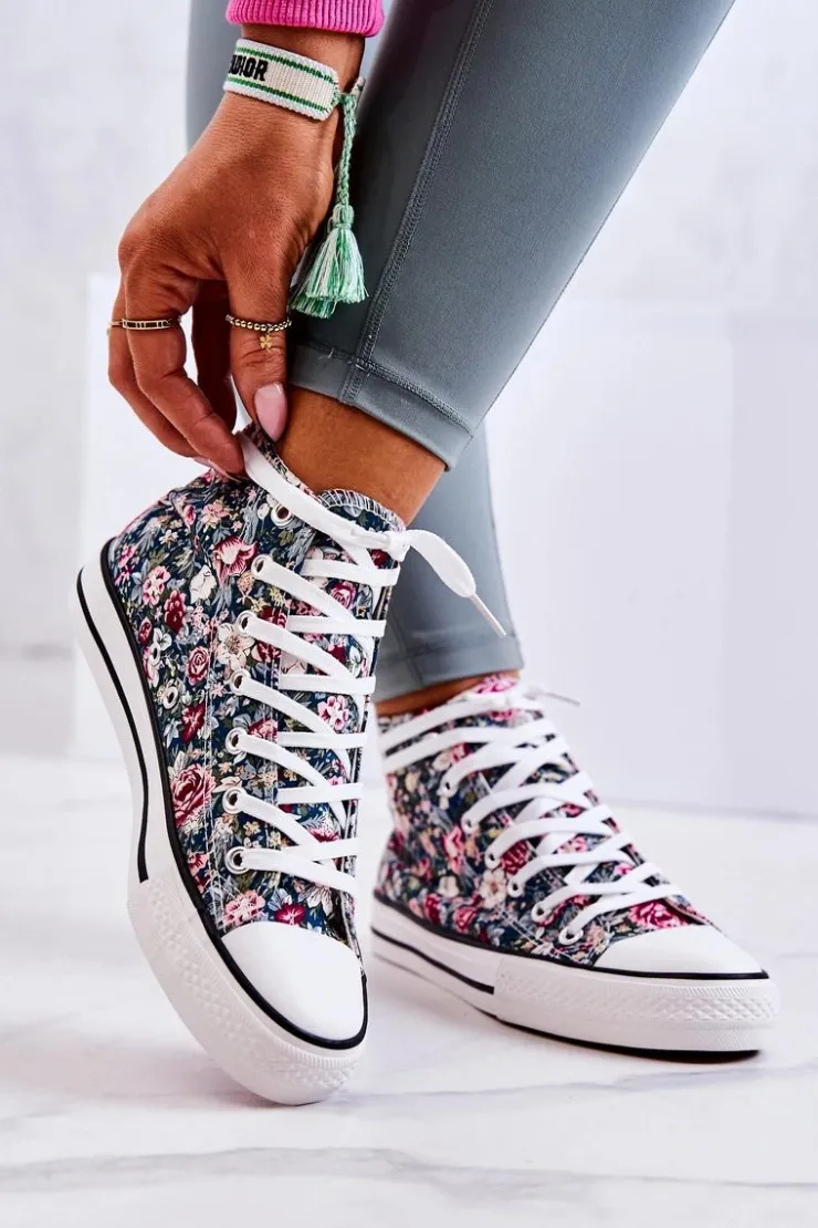 Wysokie trampki w klasycznej formie i modnym wzorze. Kultowe trampki pasują do wielu stylizacji. Buty dobrze dopasowują się do kształtu stopy, posiadają miękką, materiałową wkładkę oraz antypoślizgową podeszwę. Model wiązany z wyższą cholewką. Nosek gumowy. Koniecznie sprawdź całą naszą kolekcję damskich trampek. Przy wyborze rozmiaru prosimy sugerować się tabelą rozmiarów.
