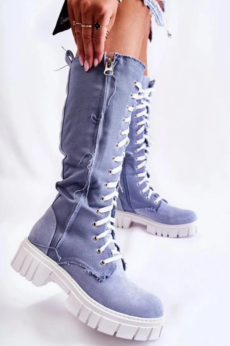 Wspaniałe kozaki w formie traperów. Wysoka cholewka została wykonana z połączenia materiału oraz eko zamszu. Zakładanie ułatwi wszyty na boku suwak, a idealne dopasowanie zapewni solidne sznurowanie na całej długości cholewki. Gruba podeszwa to dodatkowa ochrona przed zimnym podłożem. Wkładka wykonana z eko skóry. Zapiętek usztywniany. Przy wyborze rozmiaru prosimy sugerować się tabelą rozmiarów.