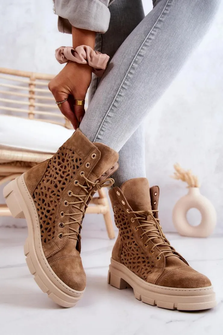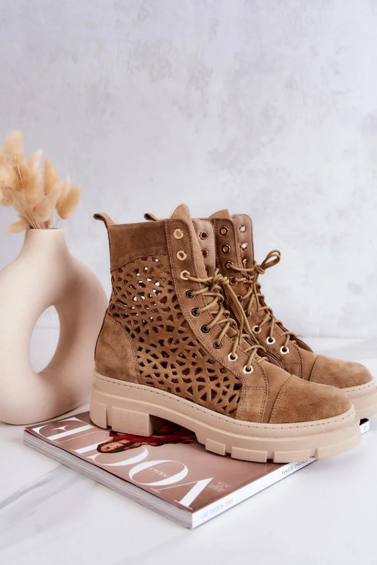 Świetne, ażurowe botki zostały wykonane z naturalnej, zamszowej skóry z dbałością o każdy detal. Skórzana wkładka oraz wygodny, płaski obcas zadbają o Twój komfort. Botki dopełnią wiele stylizacji. Posiadają klasyczne wiązanie. Powinnaś uzupełnić swoją garderobę właśnie o ten model botków, dlatego nie czekaj dłużej i kup już teraz ! Przy wyborze rozmiaru prosimy sugerować się tabelą rozmiarów.