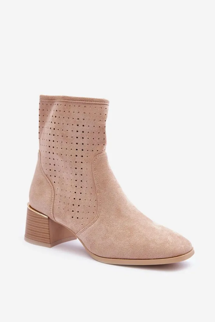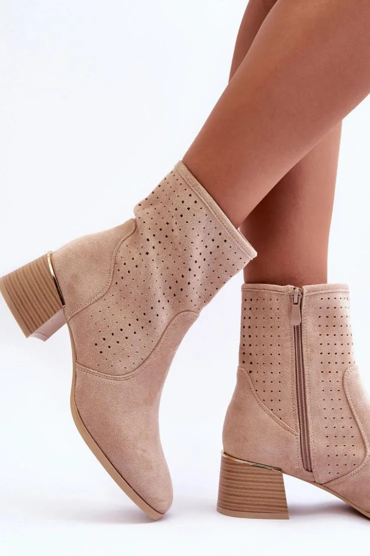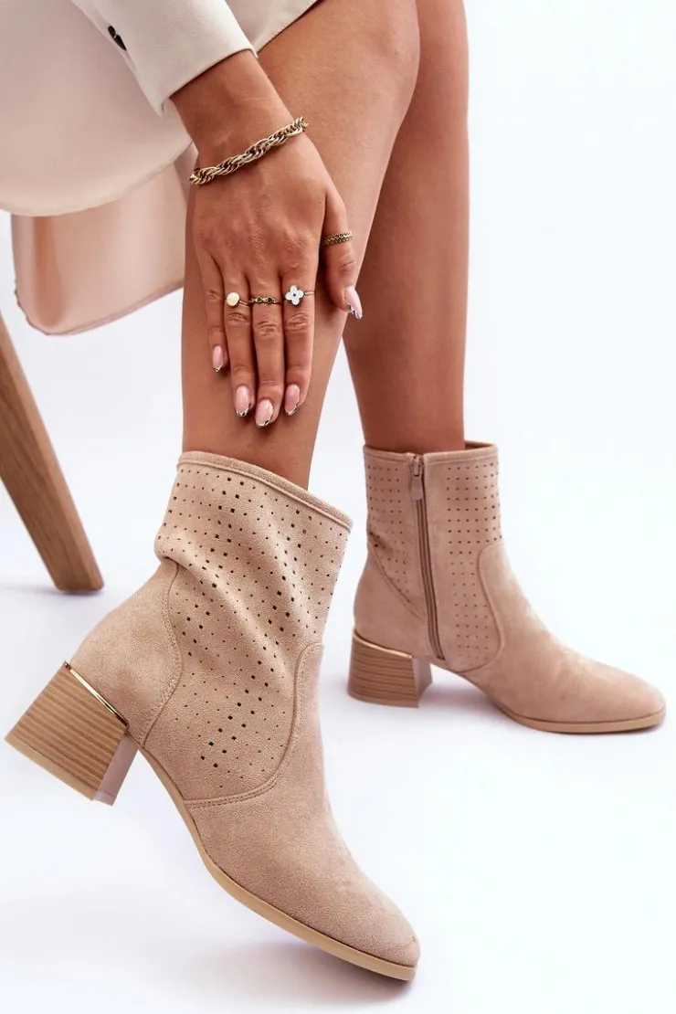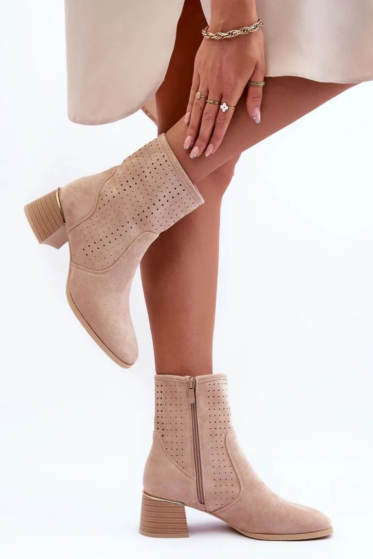 Damskie Boto Zamszowe Ażurowe Botki Na Obcasie Beżowe Perale