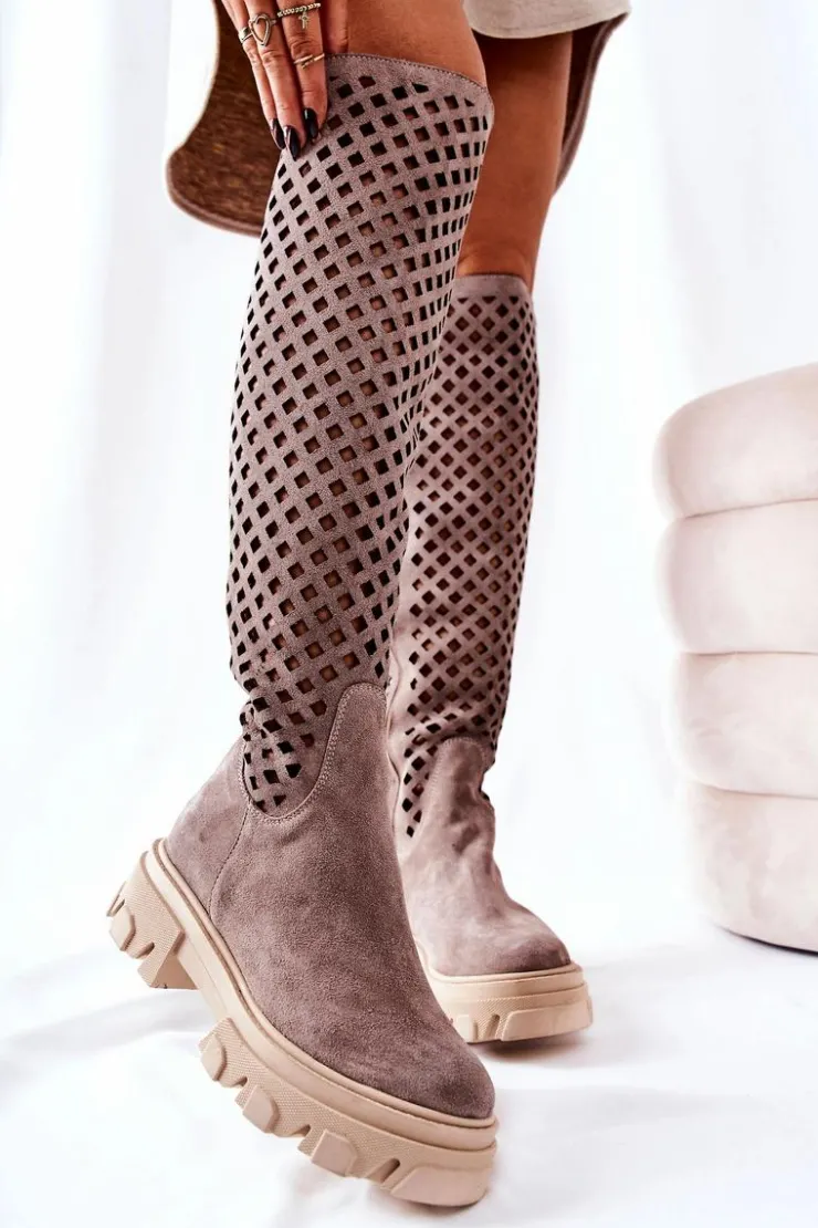 Kozaki wykonane są z naturalnej zamszowej skóry wysokiej jakości. Na długości cholewki posiadają ażurowy wzór. Workerowa podeszwa jest masywna i stabilna. Na długości całej cholewki znajduje się suwak ułatwiający zakładanie obuwia. Świetnie będą prezentować się w wielu stylizacjach. Przy wyborze rozmiaru prosimy sugerować się tabelą rozmiarów.