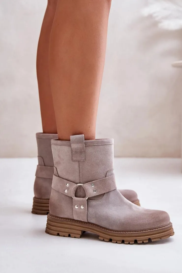 Botki wykonane z naturalnego zamszu to idealny wybór na każdą okazję. Osadzone na płaskim obcasie, zapewniają komfort i stabilność podczas chodzenia. Zaokrąglone noski dodają subtelnego charakteru. Model zapinany na zamek, co ułatwia zakładanie. Cholewka ozdobiona efektownym połączeniem pasków, które dodają stylowego akcentu. Te botki świetnie sprawdzą się w codziennych stylizacjach, łącząc elegancję z wygodą. Przy wyborze rozmiaru prosimy sugerować się tabelą rozmiarów.