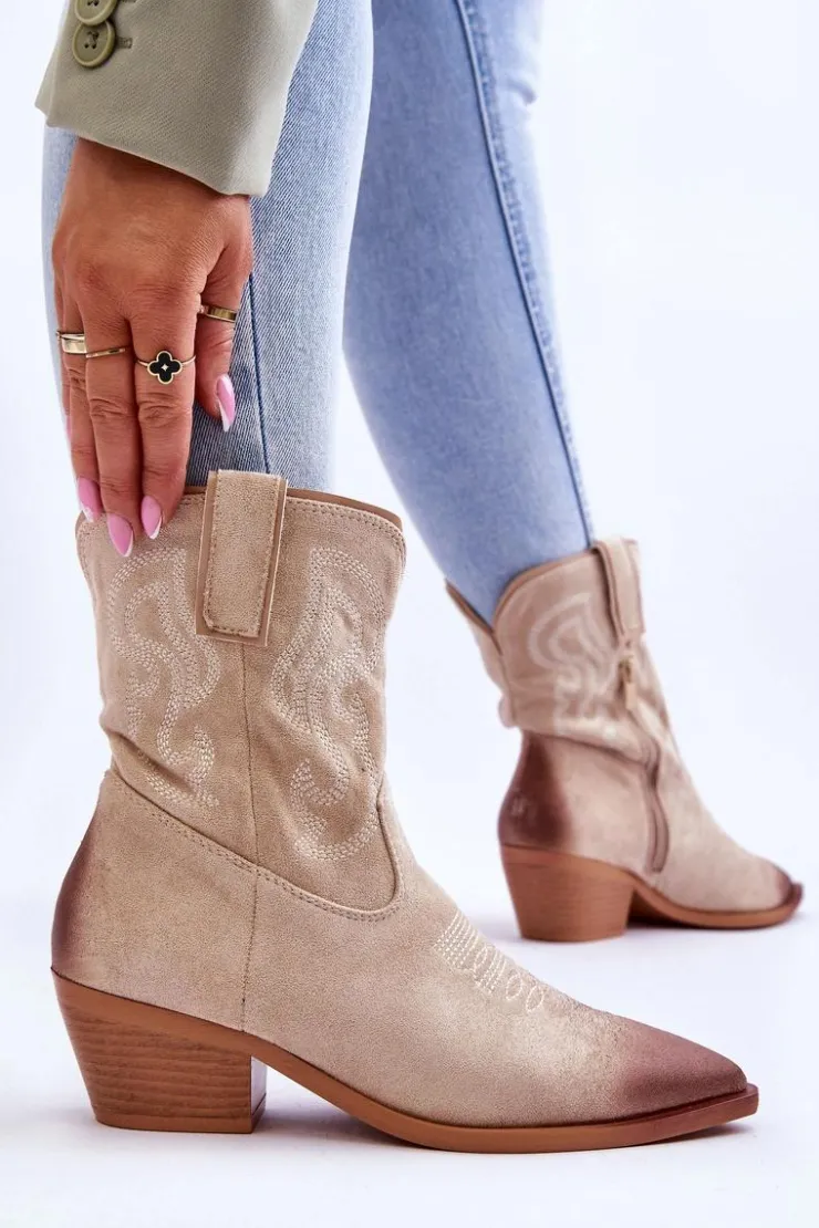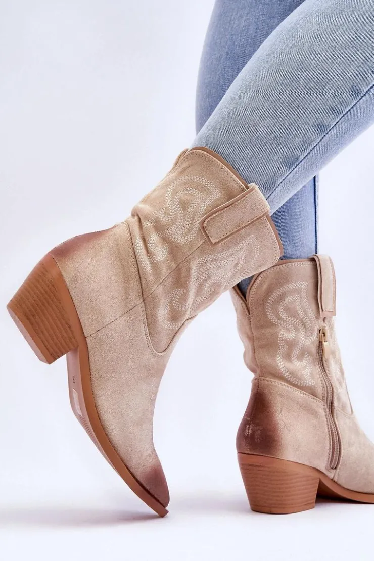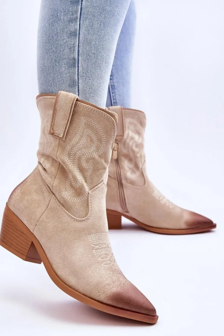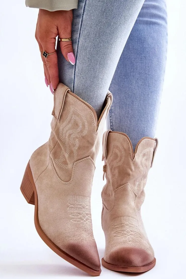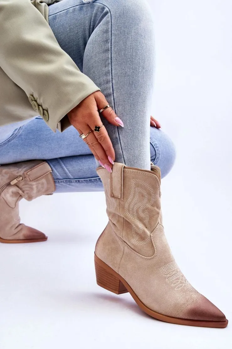 Modne botki damskie zostały wykonane z eko zamszu z przeszyciami i cieniowaniem na przodzie oraz tyle cholewki. Kowbojki na masywnym słupku zapewniają stabilność podczas użytkowania. Wsuwane oraz zapinane z boku na zamek błyskawiczny. Posiadają dodatkowo usztywniany zapiętek. Botki w stylu kowbojek będą świetnym uzupełnieniem wielu stylizacji. Przy wyborze rozmiaru prosimy sugerować się tabelą rozmiarów.