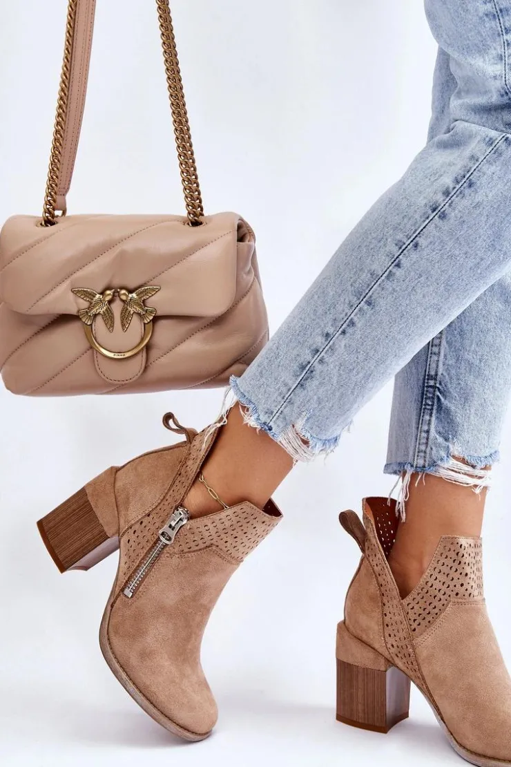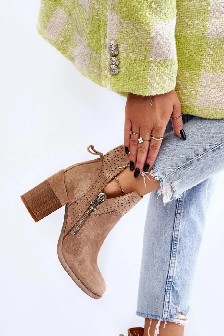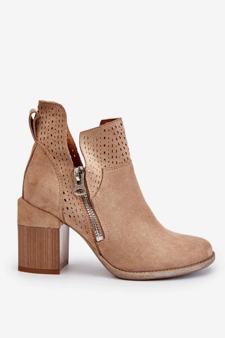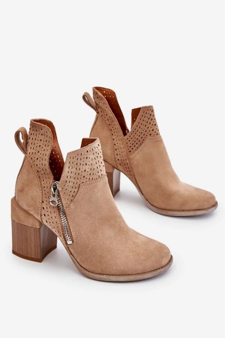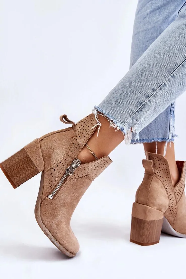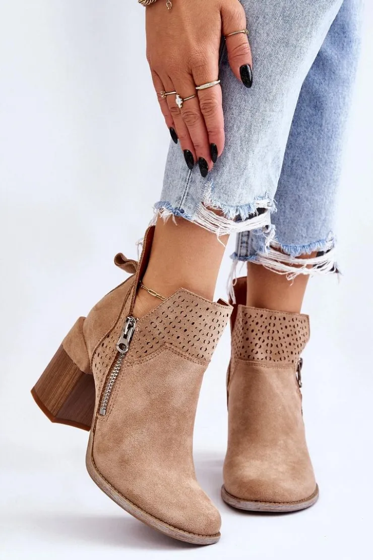 Modne botki na masywnym obcasie w postaci klocka zostały wykonane z eko zamszu z wycięciami po bokach cholewki. Dodatkowo zostały ozdobione ażurowym wzorkiem. Model ten posiada dodatkowy suwak z boku cholewki. Zapiętek w tych botkach jest usztywniany. Miękka i wygodna wkładka została wykonana z eko skóry. Powinnaś mieć ten model w swojej szafie! Przy wyborze rozmiaru prosimy sugerować się tabelą rozmiarów.