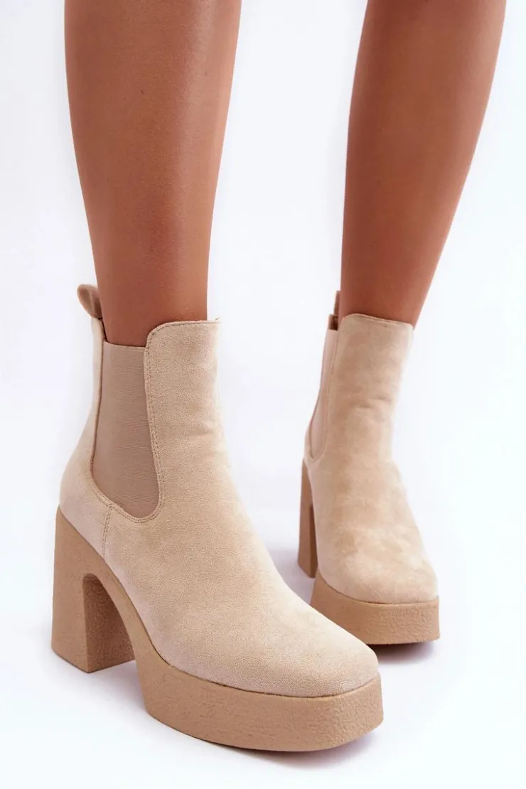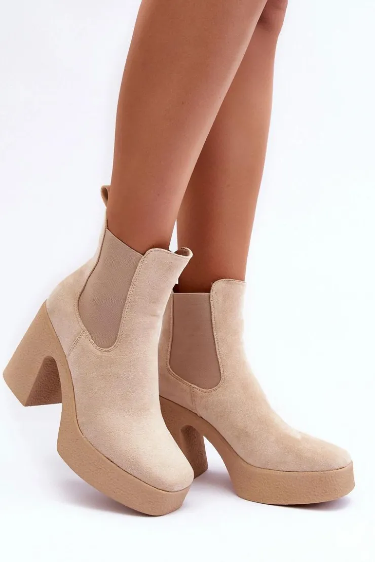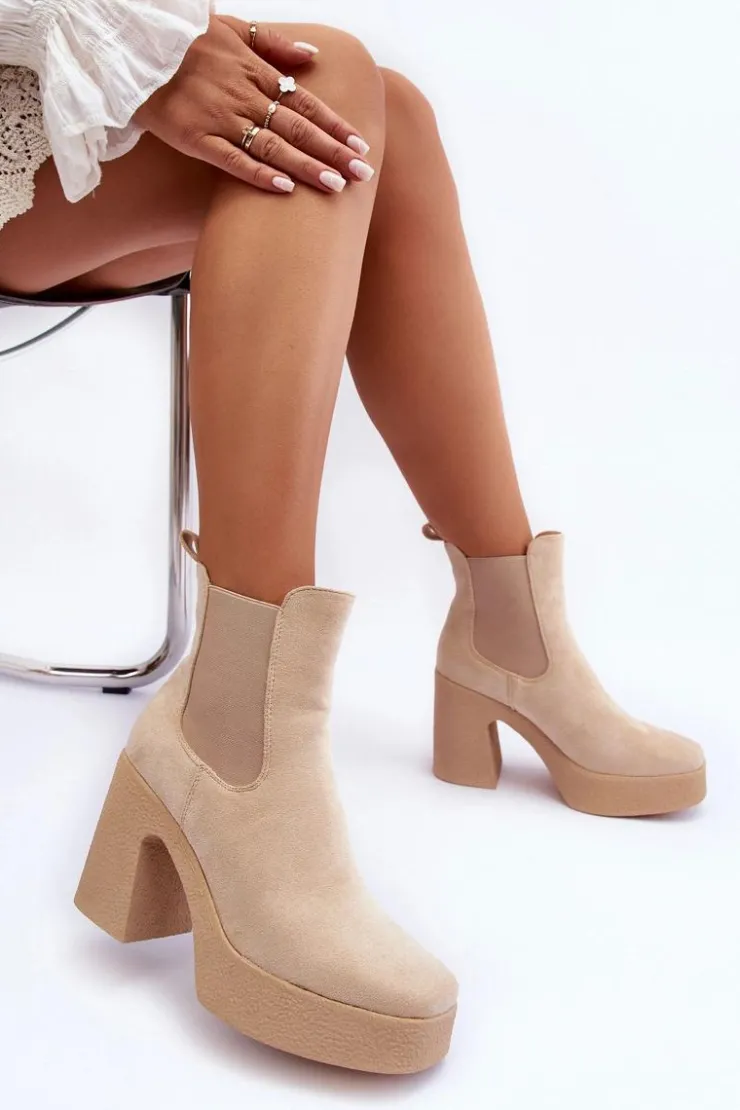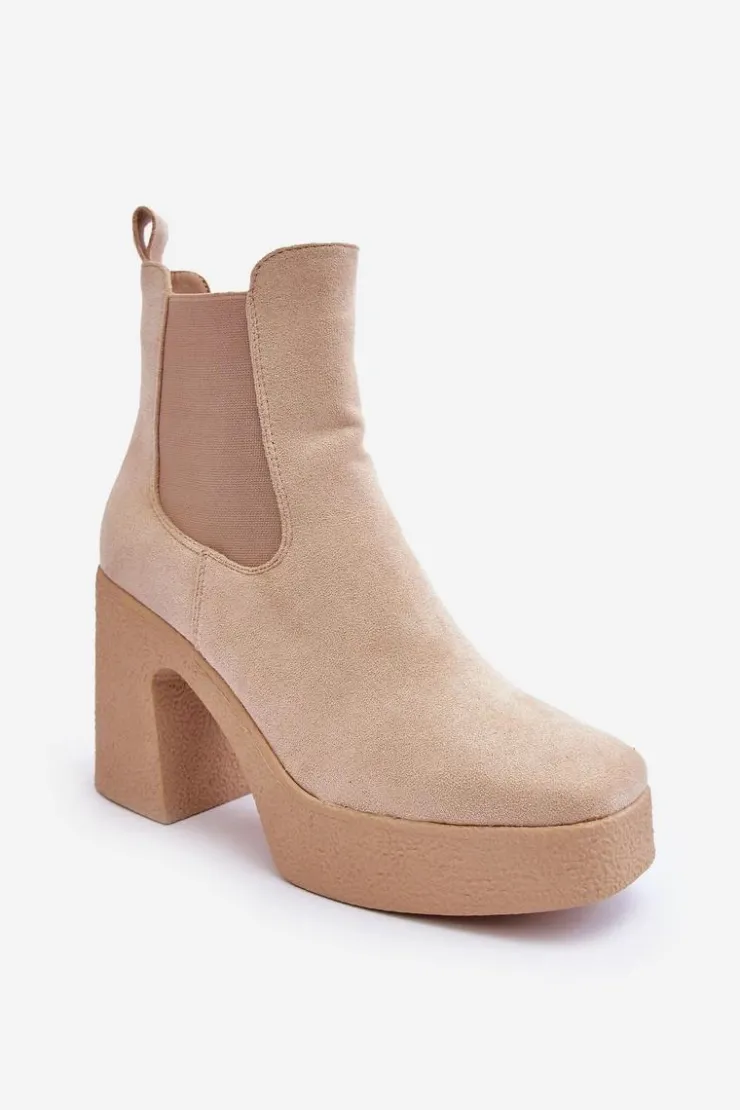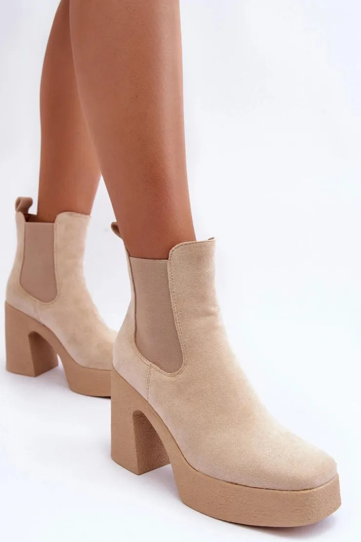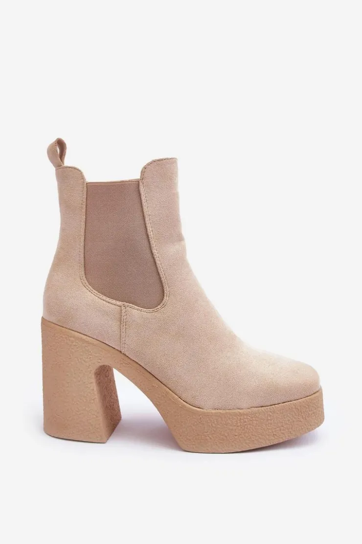 Botki wykonane z miłego w dotyku eko zamszu. Osadzone na masywnym słupku i grubej podeszwie. Buty te posiadają lekko kwadratowy nosek oraz usztywniany zapiętek. Model wsuwany. Elastyczne wstawki na cholewce. Środek ocieplony kocem obuwniczym. Świetnie uzupełnienie jesienno-zimowych stylizacji! Przy wyborze rozmiaru prosimy sugerować się tabelą rozmiarów.