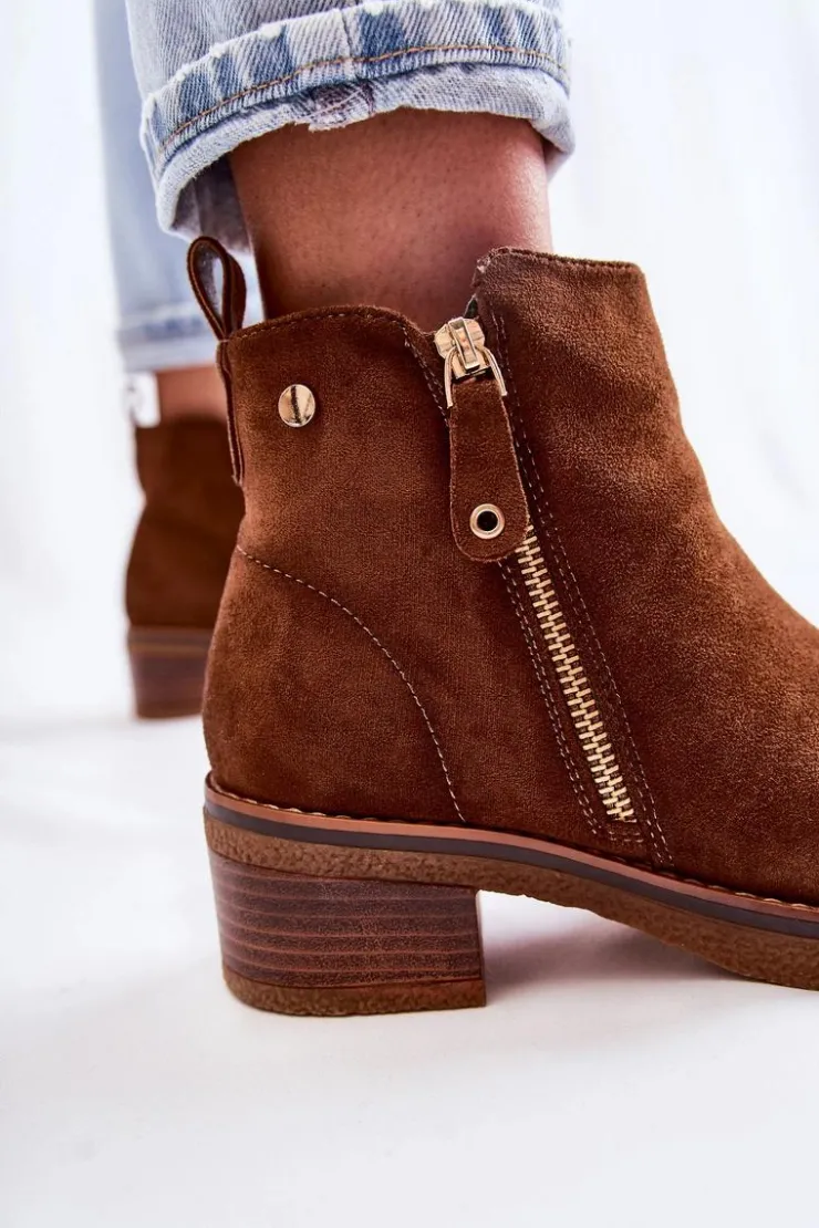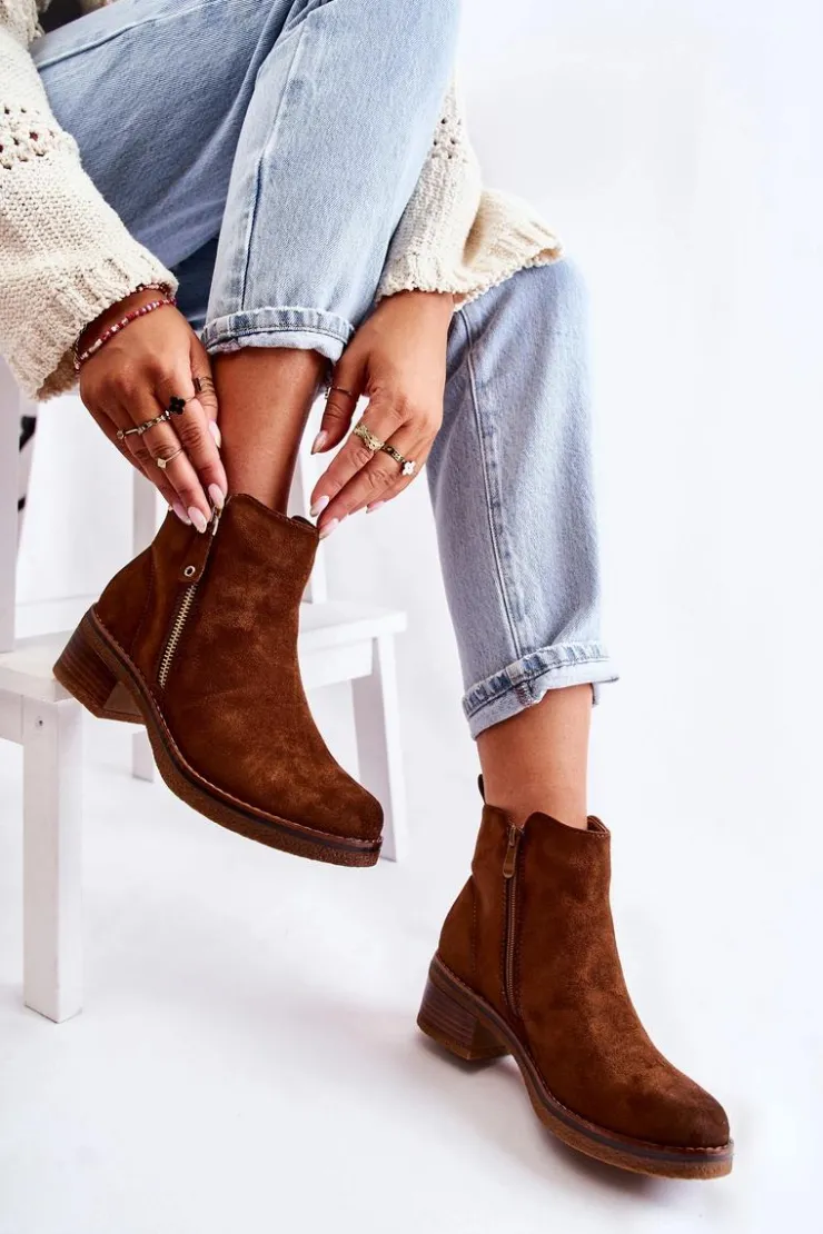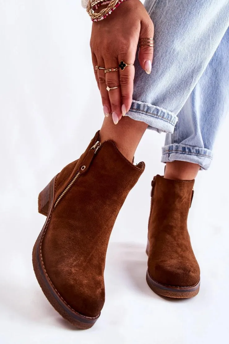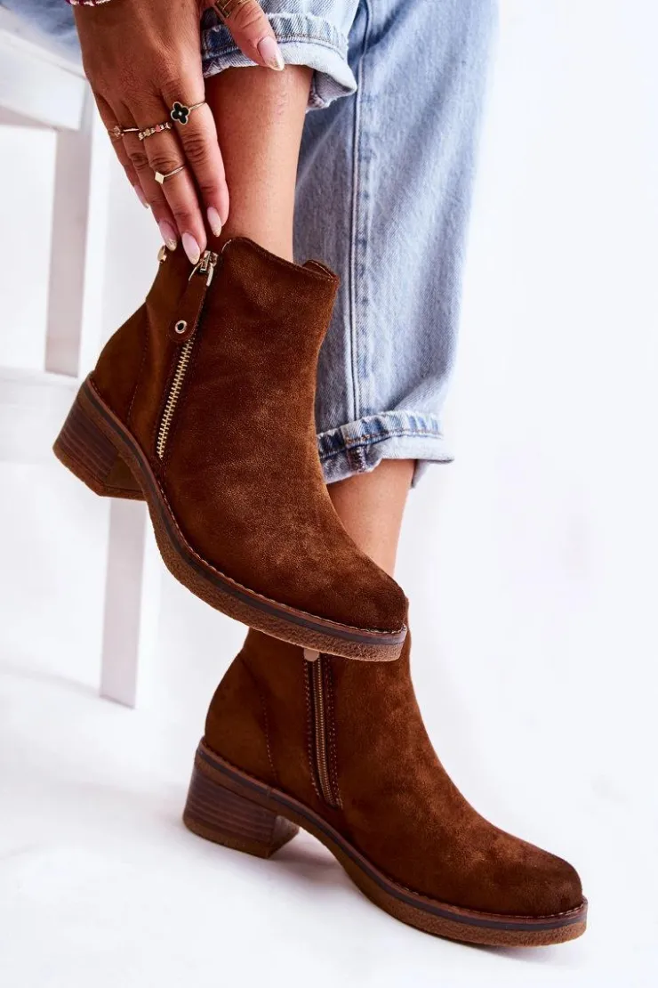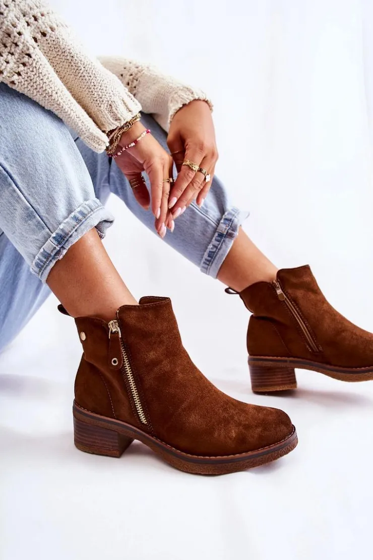 Klasyczne botki damskie osadzone na obcasie w postaci niskiego słupka. Podeszwa wykonana z gumowego tworzywa jest dodatkowo antypoślizgowa. Model posiada dwa suwaki – jeden z nich jest ozdobny. Buty zostały wykonane z eko zamszu z cholewką za kostkę. Posiadają usztywniany zapiętek. W środku ocieplane miłym w dotyku kocem obuwniczym. Świetny model na chłodniejsze dni! Przy wyborze rozmiaru prosimy sugerować się tabelą rozmiarów.