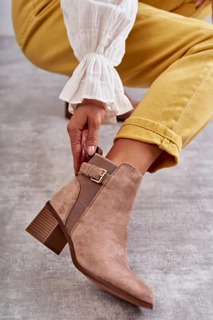 Botki wykonane z eko zamszu. Wnętrze zostało ocieplone miłym w dotyku kocem obuwniczym. Z boku cholewki znajduje się także pasek zapinany na sprzączkę. Obcas w postaci masywnego słupka. Modny fason sprawia, że możesz założyć je do wielu stylizacji. Nosek zaokrąglony. Buty posiadają także usztywniany zapiętek. W tych botkach jesienne dni nie będą już takie straszne! Przy wyborze rozmiaru prosimy sugerować się tabelą rozmiarów.