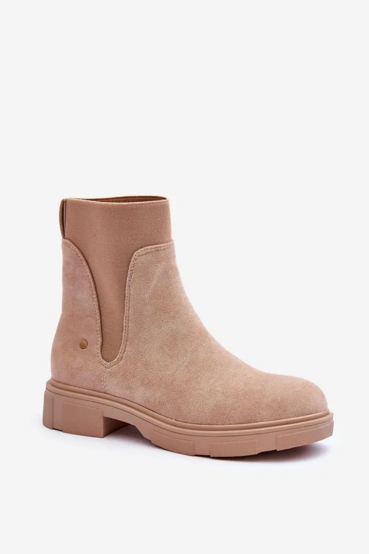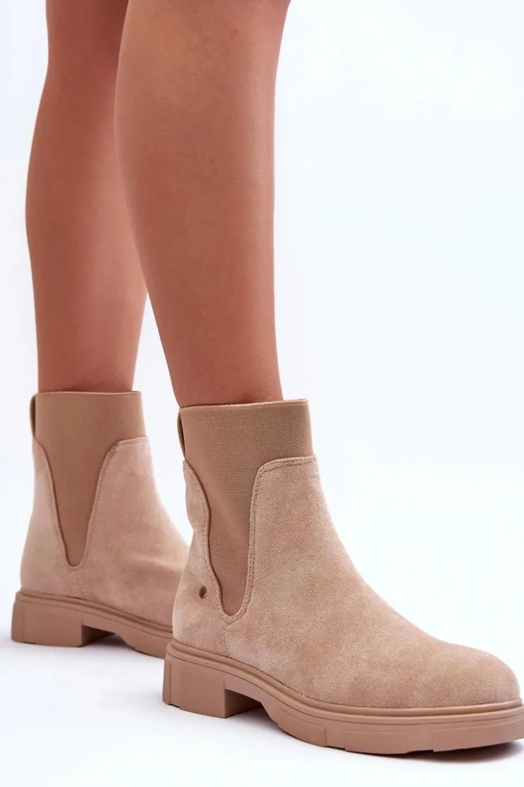Damskie botki zostały wykonane z miłego w dotyku eko zamszu. Osadzono je na platformie i płaskim obcasie. Model ten posiada elastyczne wstawki na cholewce. Nie czekaj aż znikną i kup już dziś! Przy wyborze rozmiaru prosimy sugerować się tabelą rozmiarów.