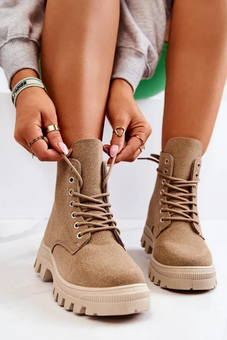 Śliczne trapery zachwycą niejedną miłośniczkę odważnych, modnych, a przede wszystkim wygodnych stylizacji! Wykonane z zamszowej eko skóry na zewnątrz. W środku wygodna wkładka została wykonana z eko skóry. O idealne dopasowanie do nóg zadba solidne sznurowanie. Traperowa podeszwa zadba o stabilność na nierównych nawierzchniach. Przy wyborze rozmiaru prosimy sugerować się tabelą rozmiarów.