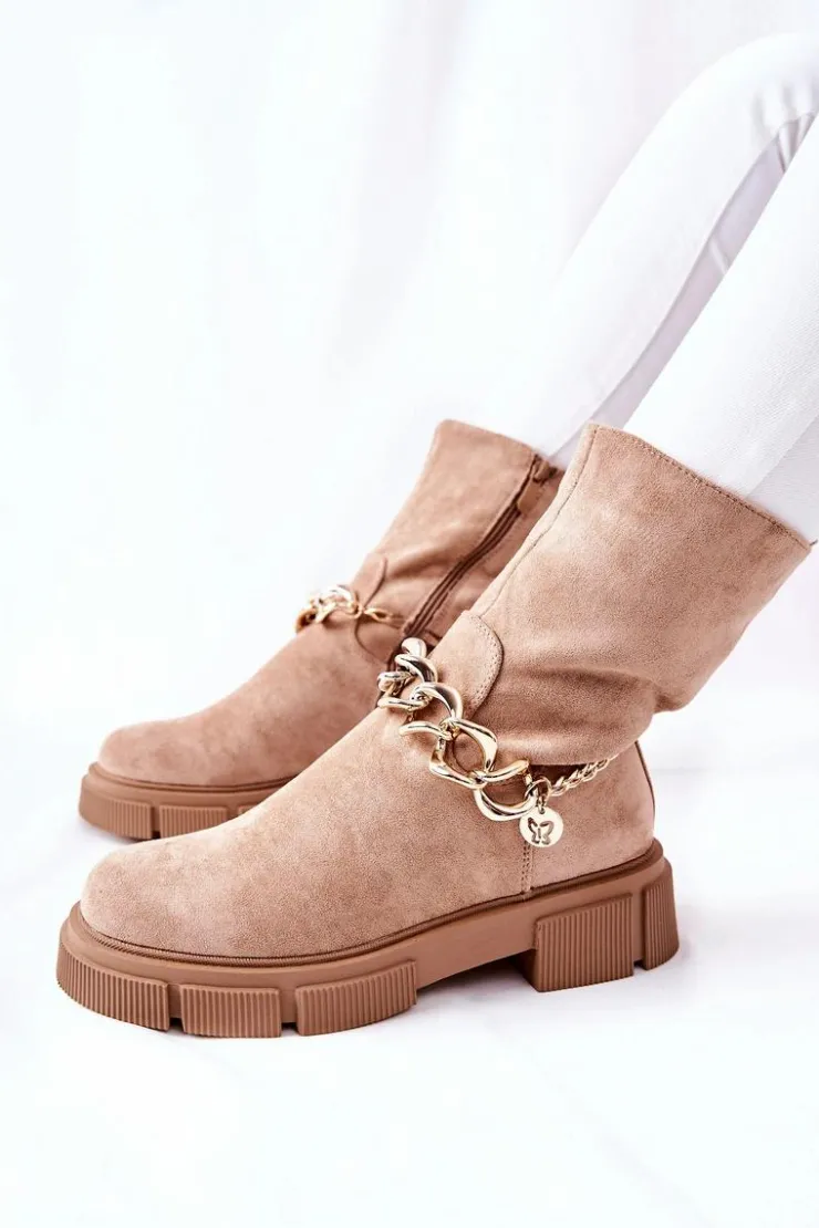Piękne botki wykonane z eko zamszu będą idealne do wielu stylizacji. Gruba podeszwa sprawia, że botki są stabilne. Ozdobny łańcuch sprawia, że wyglądają bardzo stylowo. Zapinane na suwak. Środek ocieplany delikatnym futerkiem. Nie przegap okazji i kup je już dziś!Przy wyborze rozmiaru prosimy sugerować się tabelą rozmiarów.