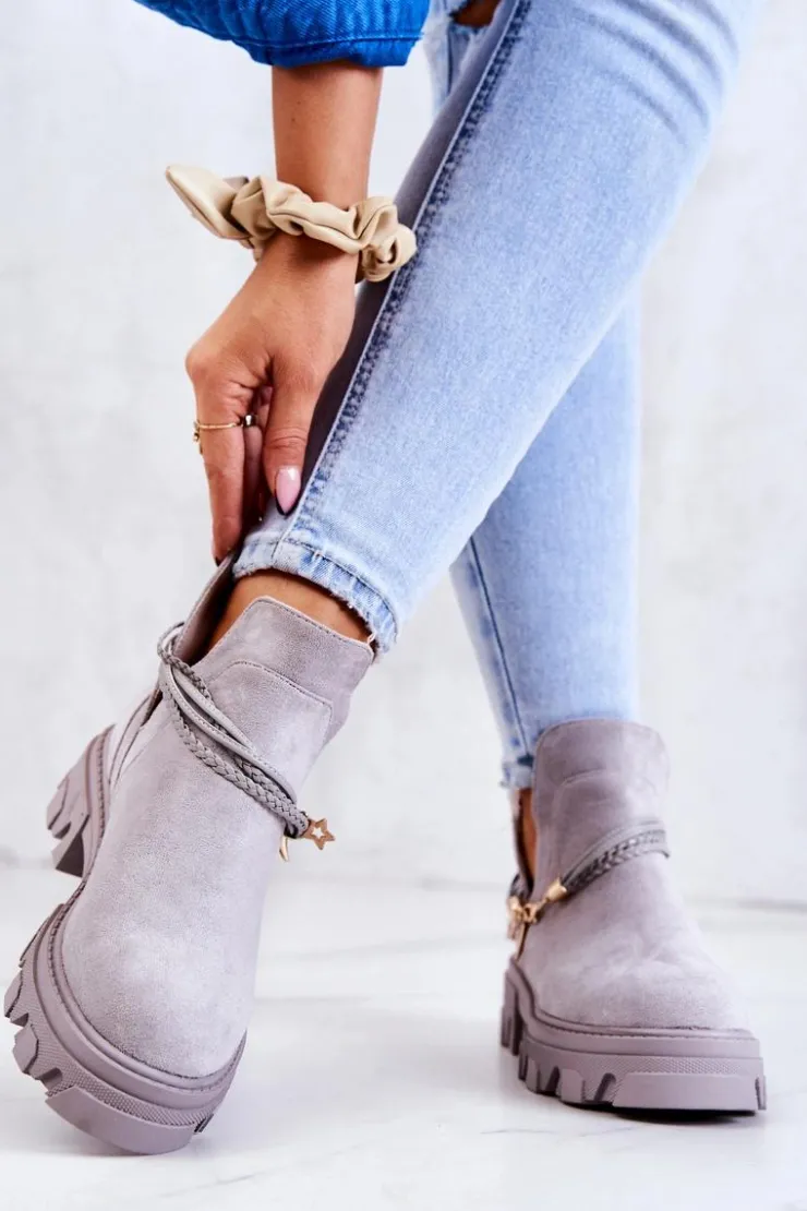 Botki z wycięciami wykonane z eko zamszu. Posiadają masywną podeszwę chroniącą przed zimnym podłożem. Plecione, dekoracyjne paski posiadają dodatkowo zawieszkę w postaci gwiazdy z cyrkoniami. Można je odpiąć. Wycięcia na kostkę sprawiają, że te botki wyglądają bardzo efektownie. Przy wyborze rozmiaru prosimy sugerować się tabelą rozmiarów.