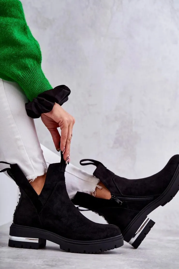 Damskie botki posiadają efektowne wycięcia po bokach cholewki. Z przodu oraz z tyłu posiadają pętelki ułatwiające zakładanie obuwia. Dodatkowo z boku cholewki znajduje się suwak. Botki zostały wykonane z miłego w dotyku eko zamszu. Posiadają usztywniany zapiętek. W środku ocieplone kocem obuwniczym. Osadzone na płaskim obcasie i niewysokiej platformie.Przy wyborze rozmiaru prosimy sugerować się tabelą rozmiarów.