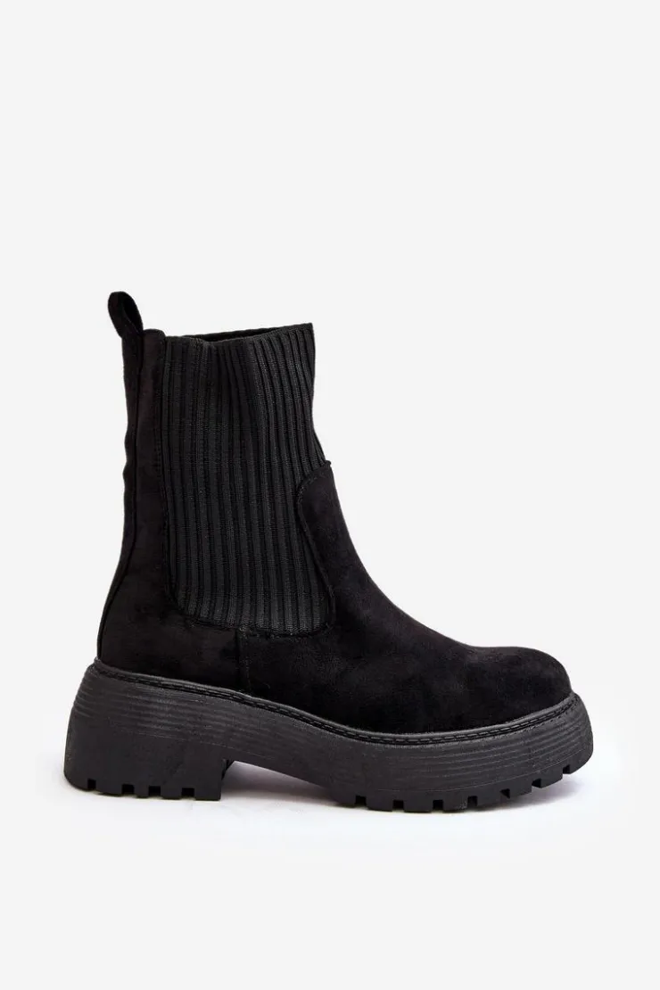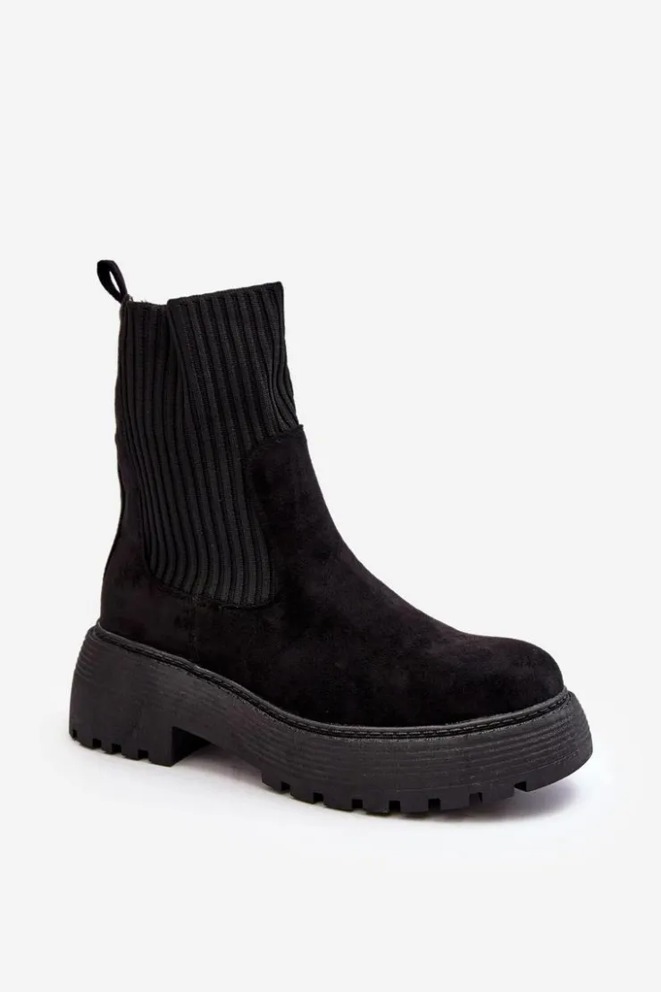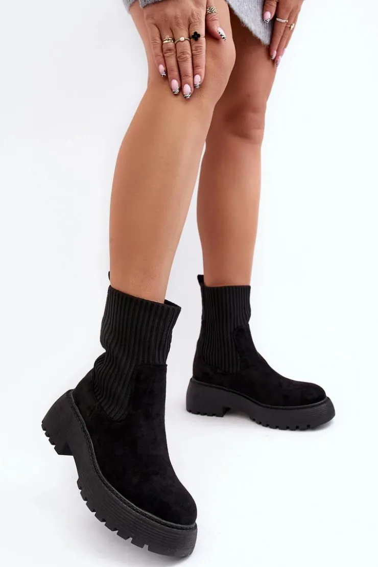 Botki damskie wykonane z połączenia eko zamszu i tkaniny. Osadzone na płaskim obcasie i platformie. Cholewka w formie skarpety. Model wsuwany. Noski zaokrąglone. Środek częściowo ocieplony. Nie czekaj aż znikną i kup już dziś! Przy wyborze rozmiaru prosimy sugerować się tabelą rozmiarów.