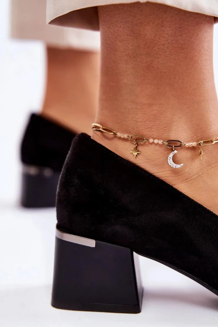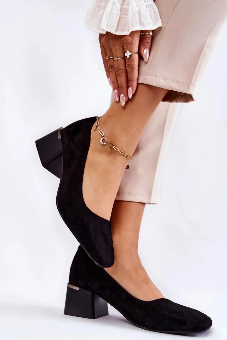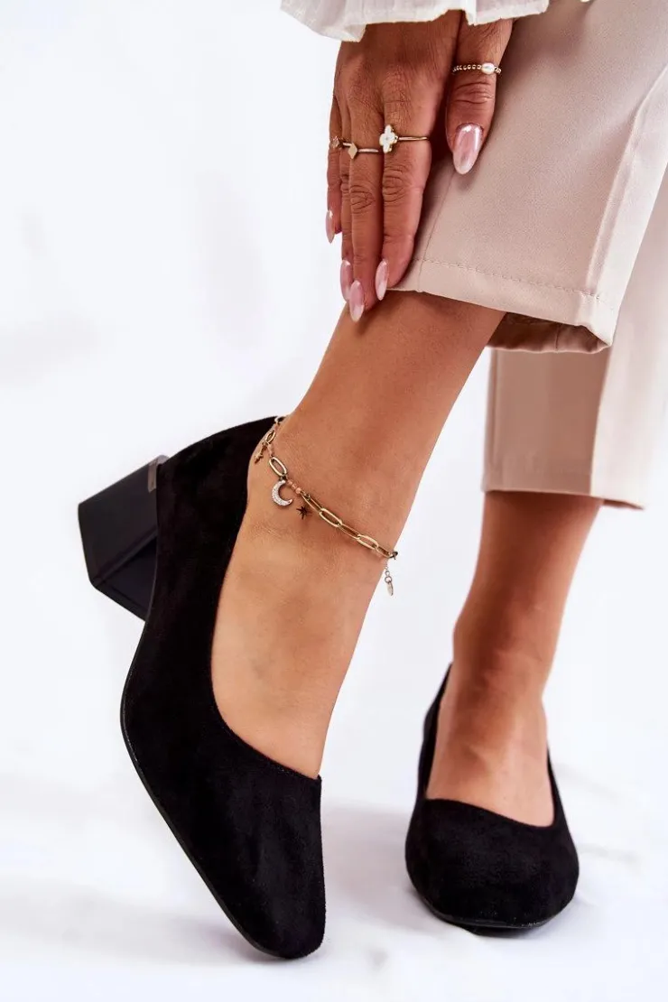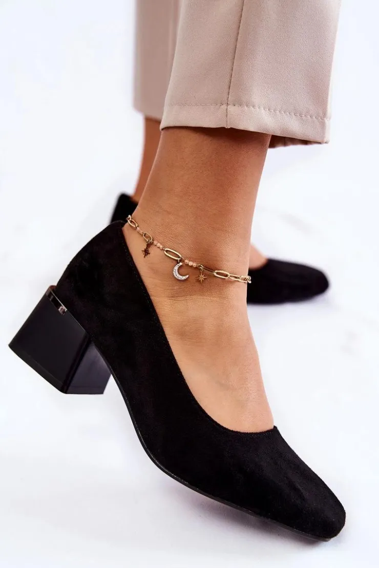Klasyczne czółenka zostały wykonane z wysokiej jakości eko skórzanych materiałów. Posiadają usztywniany zapiętek oraz kwadratowy nosek. Świetny model do wielu stylizacji! Czółenka te posiadają miękką wkładkę wykonaną z naturalnej skóry, która zapewni wygodę podczas użytkowania. Zostały osadzone na obcasie w postaci klocka, co gwarantuje stabilizację. Przy wyborze rozmiaru prosimy sugerować się tabelą rozmiarów.