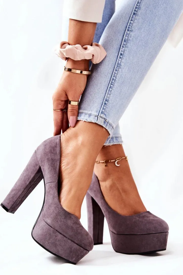 Świetne czółenka zostały wykonane z eko zamszowej skóry. Model na wysokim słupku oraz platformie, który uniesie sylwetkę i wysmukli nogi. Wkładka wykonana z eko skóry. Delikatny nosek w postaci migdała. Klasyczny wzór powinien znaleźć się w garderobie każdej kobiety! Przy wyborze rozmiaru prosimy kierować się tabelą rozmiarów