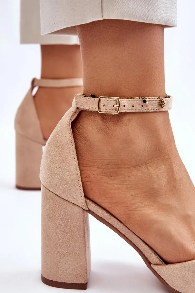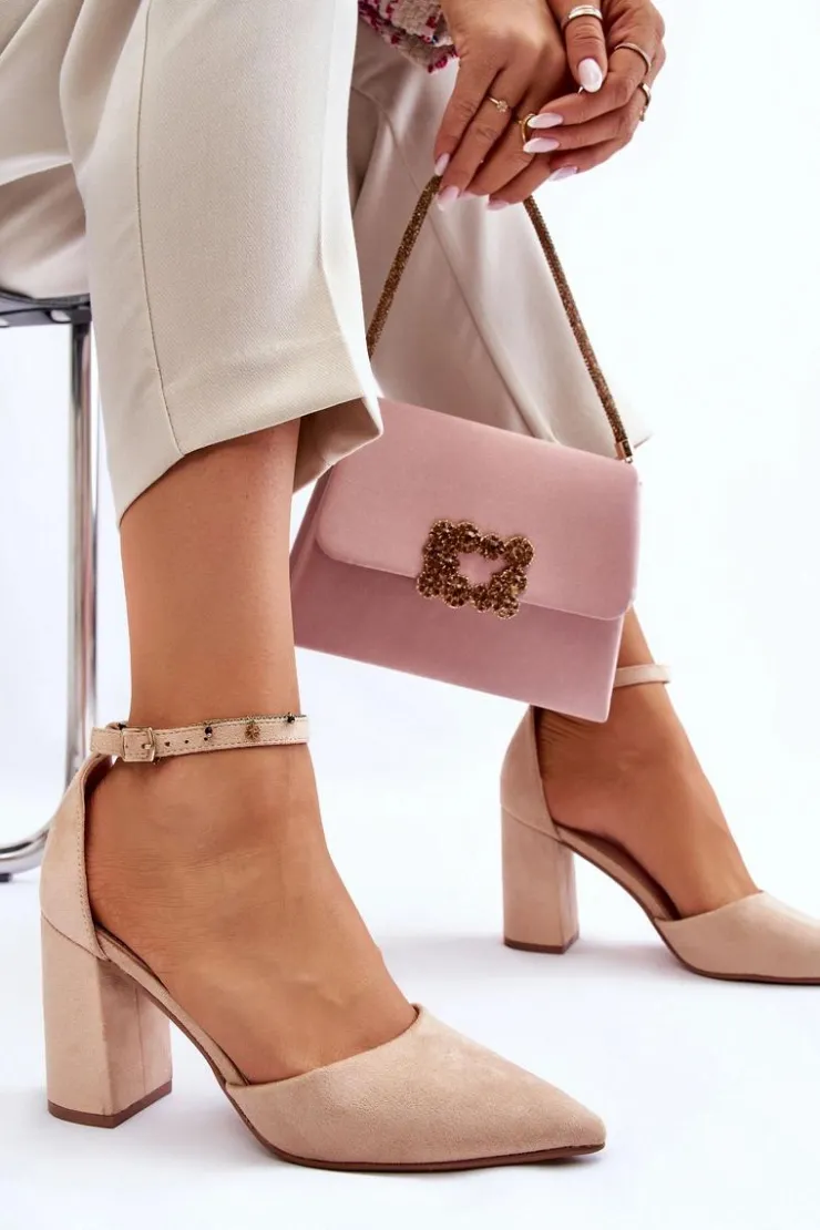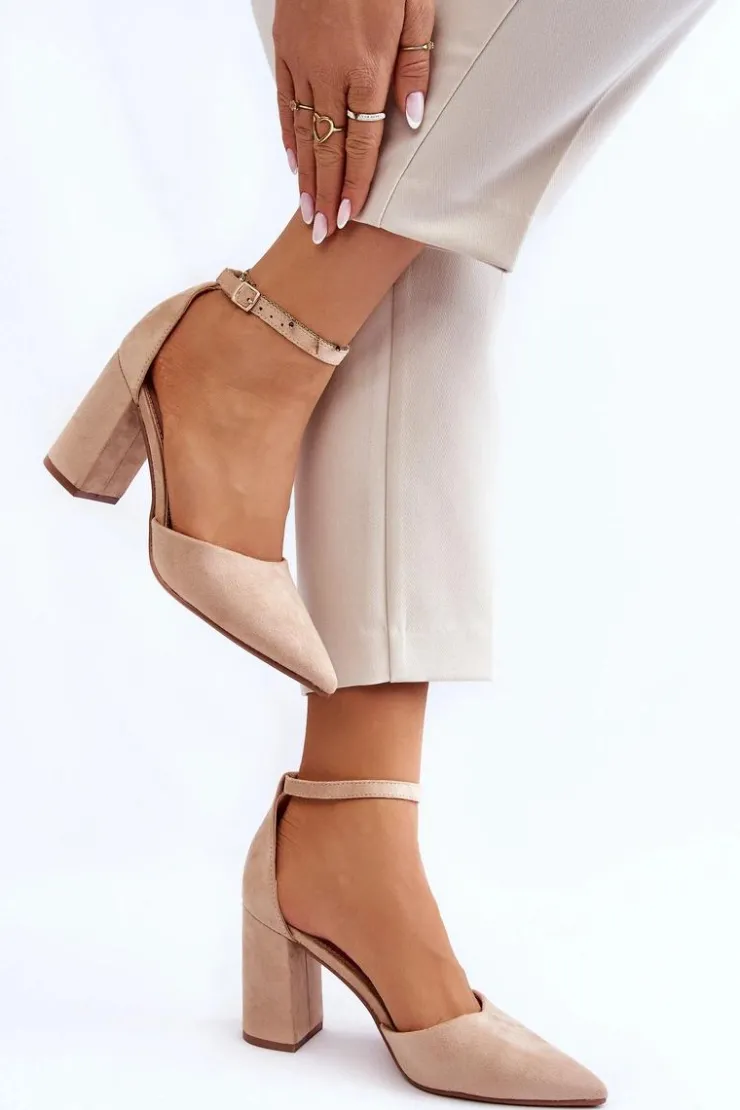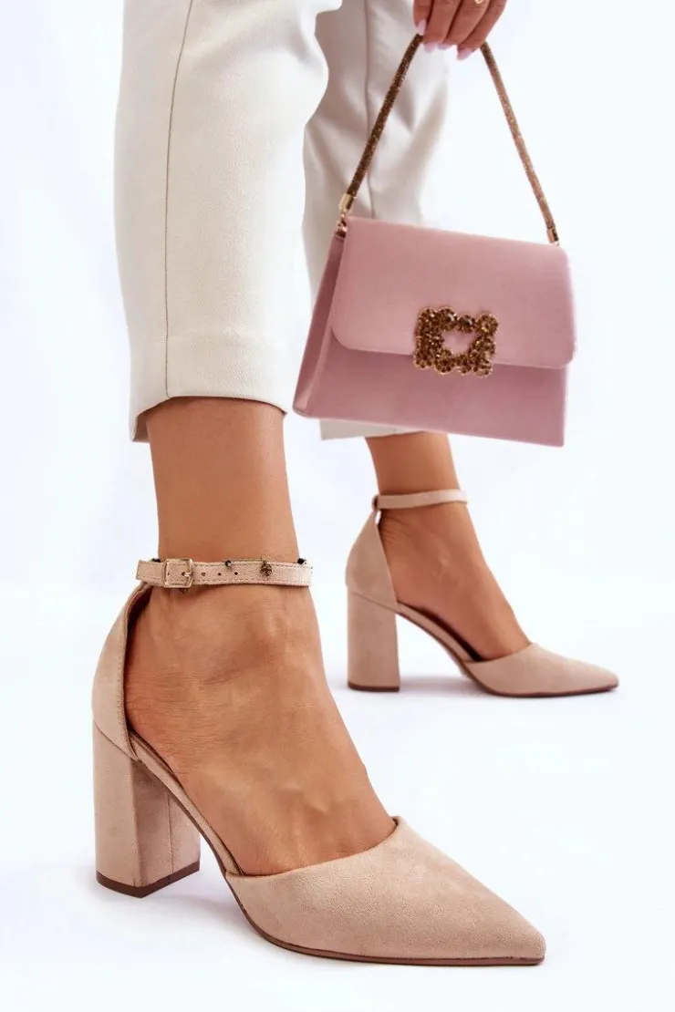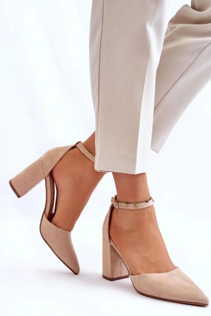 Klasyczne czółenka z noskiem w szpic zostały wykonane z eko zamszu. Zapinane wokół kostki na sprzączkę z regulowanym paskiem. Miękka wkładka z eko skóry zapewnia wysoki komfort użytkowania. Czółenka zostały osadzone na obcasie w postaci słupka. Świetnie sprawdzą się w zestawieniu z sukienkami, eleganckimi spodniami czy jeansami. Przy wyborze rozmiaru prosimy kierować się tabelą rozmiarów