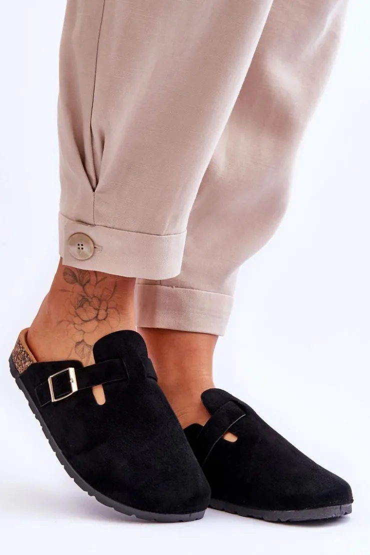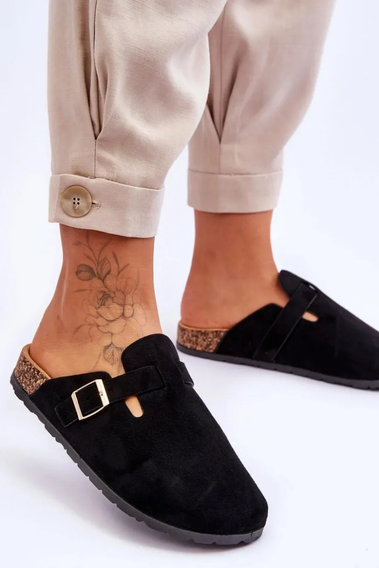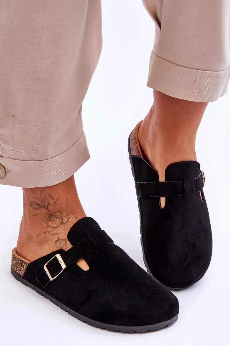 Klapki zostały osadzone na korkowej platformie z podeszwą z tworzywa sztucznego. Klapki zostały wykonane z eko zamszu. Posiadają profilowaną wkładkę z eko zamszu. Dodatkowo zostały ozdobione regulowanym paseczkiem ze sprzączką. Klapki z zabudowanym noskiem możesz używać także zamiast papci. Przy wyborze rozmiaru prosimy sugerować się tabelą rozmiarów.