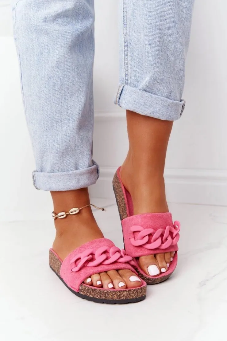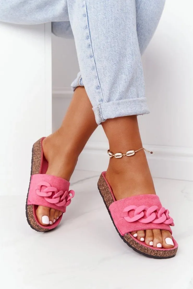 Wyjątkowe klapki damskie wykonane z eko zamszu. Buty posiadają profilowaną wkładkę, która zagwarantuje komfort. Modny fason ozdobiony lekkim łańcuchem urozmaici Twoje stylizacje! Przy wyborze rozmiaru prosimy sugerować się tabelą rozmiarów.