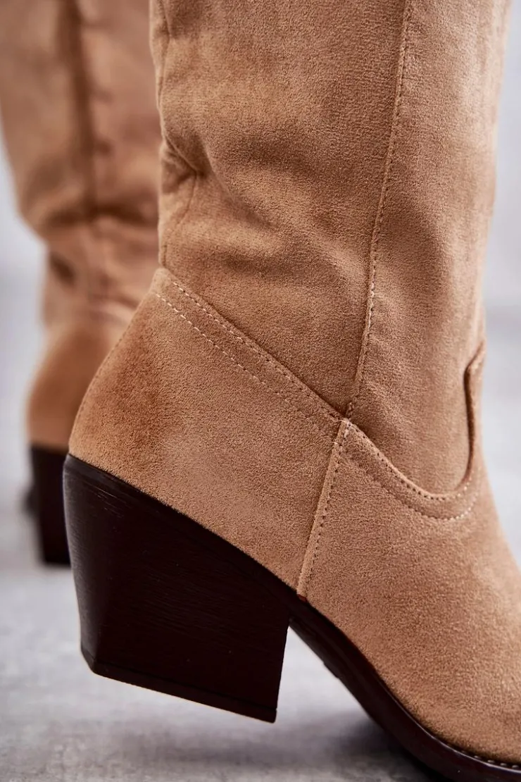 Kozaki – kowbojki zostały wykonane z przyjemnego w dotyku eko zamszu. Posiadają delikatne przeszycia na przodzie. Kozaki o fasonie kowbojek posiadają nosek w szpic oraz masywny obcas w postaci słupka. Model wsuwany z dodatkowym suwakiem z boku cholewki. Wkładka wykonana z eko skóry. Kozaki posiadają usztywniany zapiętek. Ten wyjątkowy model powinien być właśnie Twój! Przy wyborze rozmiaru prosimy sugerować się tabelą rozmiarów.