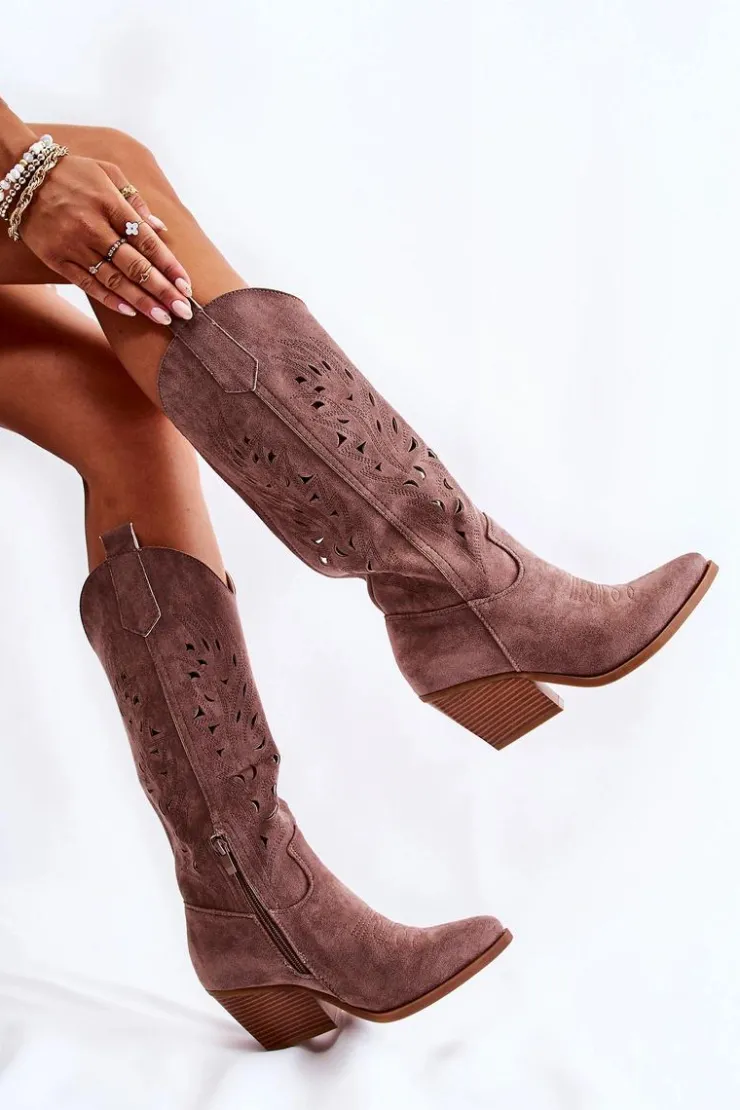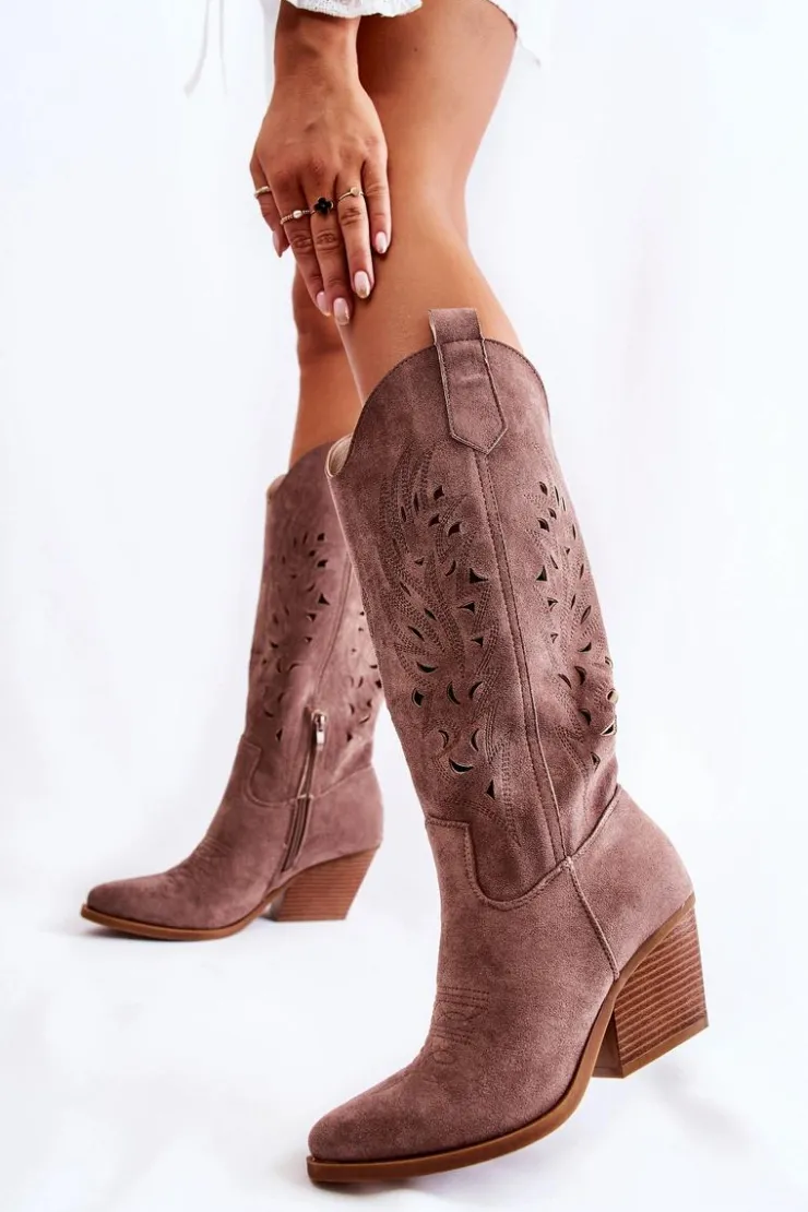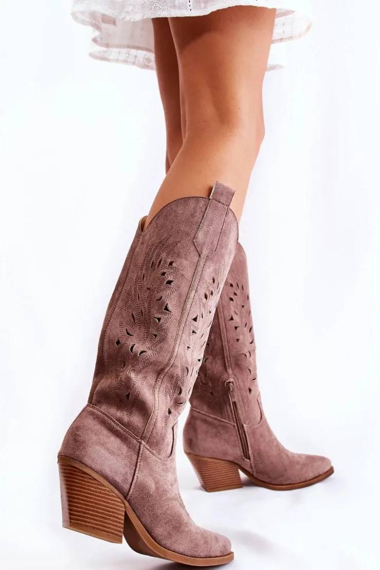 Wygodnie i stylowo – tak właśnie poczujesz się w tych kozakach! Ażurowa cholewka została wykonana z eko zamszu. Obuwie posiada eko skórzaną wkładkę, usztywniany zapiętek oraz suwak ułatwiający zakładanie obuwia. Osadzone na obcasie w postaci słupka. Nosek w szpic. Świetnie sprawdzą się w stylizacjach z dłuższymi spódnicami czy jeansami. Przy wyborze rozmiaru prosimy sugerować się tabelą rozmiarów.