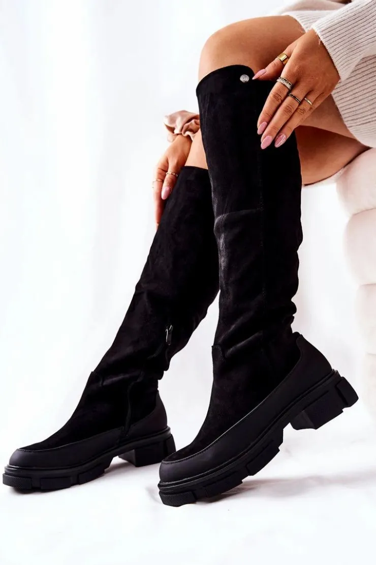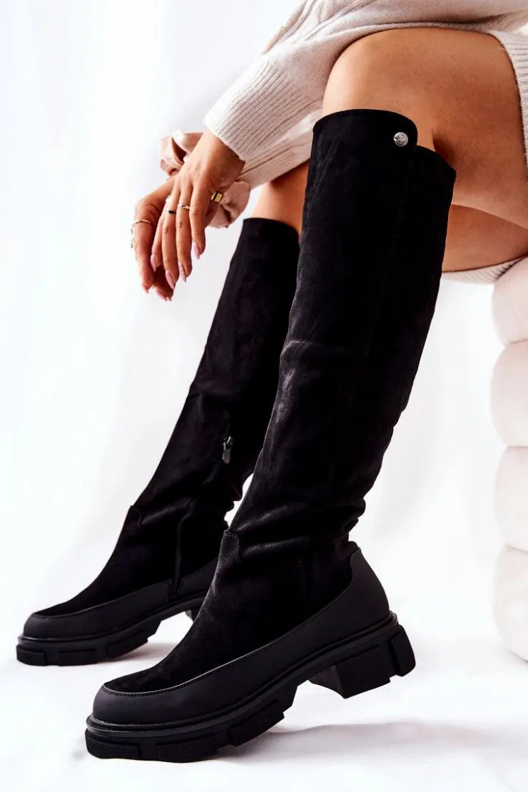 Piękne kozaki w jednym z najmodniejszych fasonów. Model wykonany z miłego w dotyku eko zamszu. Buty posiadają suwak do połowy cholewki na wewnętrznej stronie, który ułatwia zakładanie. U góry cholewki znajduje się mały emblemat. Przy podeszwie buty są wykończone materiałem z eko skóry. Przy wyborze rozmiaru prosimy sugerować się tabelą rozmiarów.