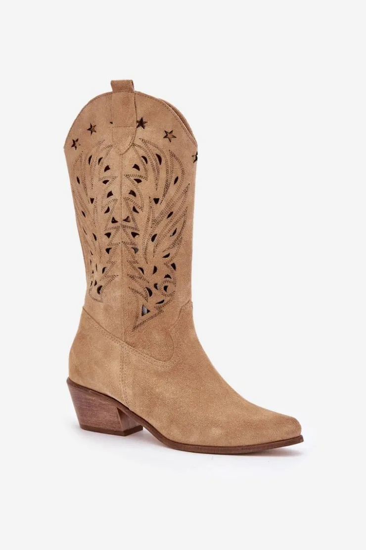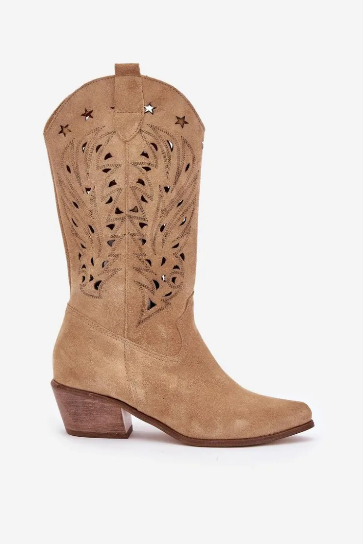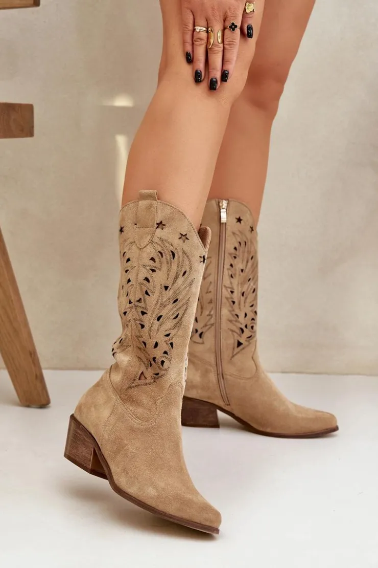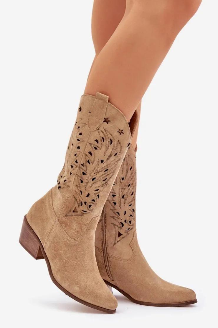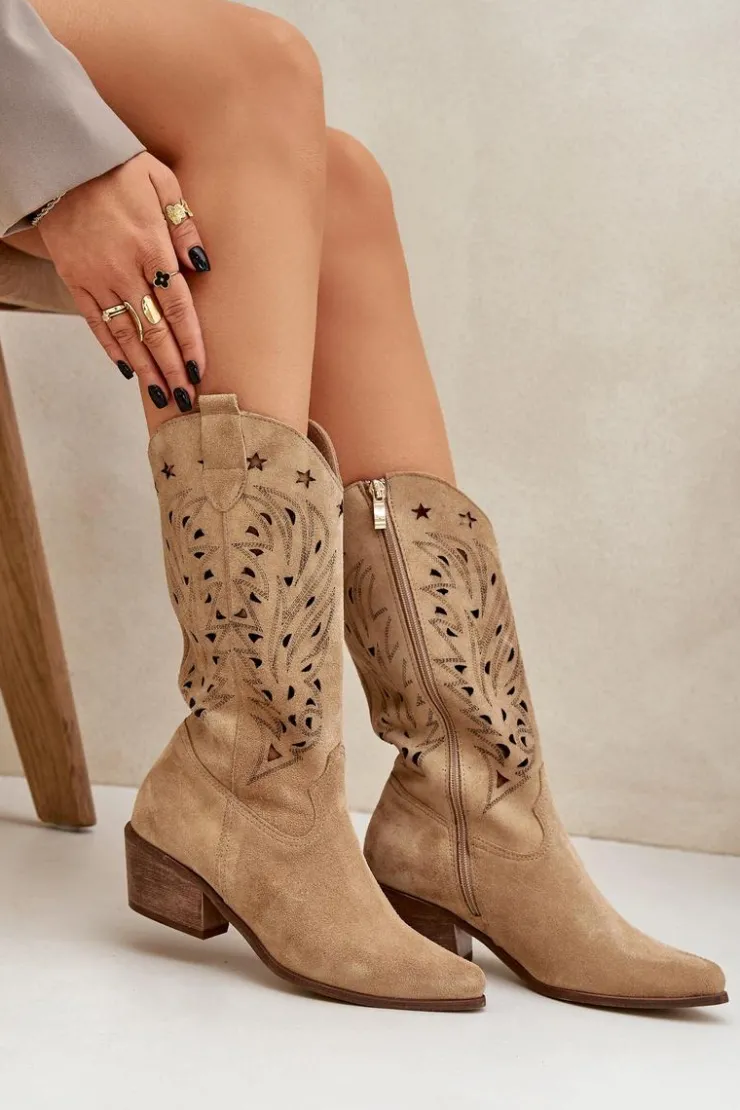 Kozaki do połowy łydki z ażurową cholewką. Zapinane na zamek. Wykonane z wysokiej jakości naturalnego zamszu. Noski w szpic. Te kozaki doskonale sprawdzą się w wielu codziennych stylizacjach. Miękka, skórzana wkładka gwarantuje komfort podczas noszenia. Ażurowe kozaki to doskonały wybór do różnych wiosennych stylizacji! Przy wyborze rozmiaru prosimy sugerować się tabelą rozmiarów.