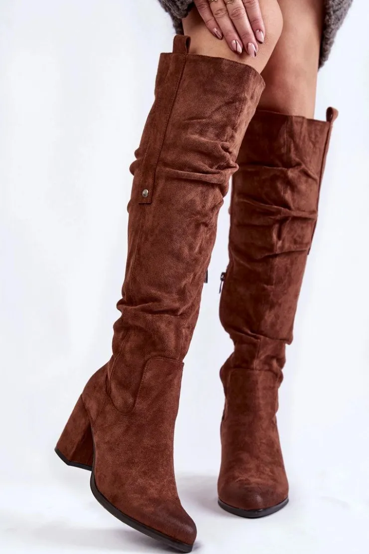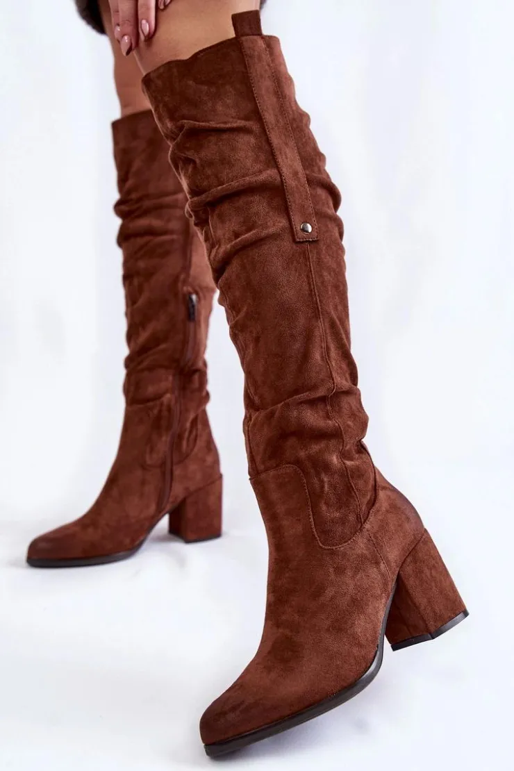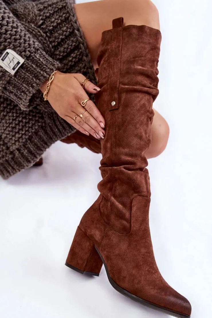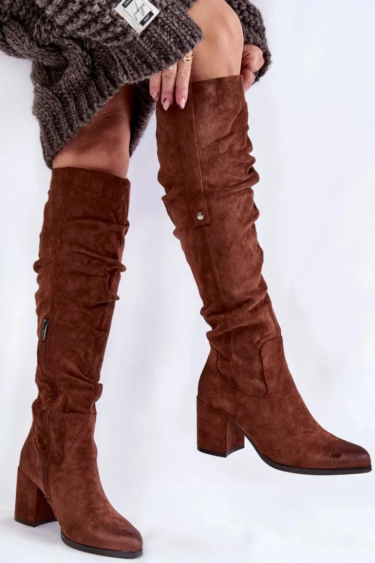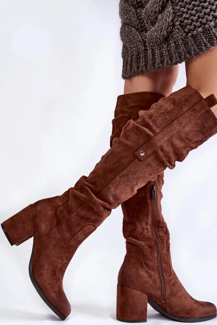 Rewelacyjne kozaki damskie zostały wykonane z wysokiej jakości eko zamszu z dbałością o szczegóły. Model ten został osadzony na niskim obcasie w postaci słupka. Kozaki z cholewką za kolano zostały przyozdobione delikatnym marszczeniem oraz pojedynczą napą z boku cholewki. Zapinane na suwak oraz wsuwane. Dodatkowo zapiętek jest usztywniany. Kozaki zostały ocieplone delikatnym futerkiem. Przy wyborze rozmiaru prosimy sugerować się tabelą rozmiarów.