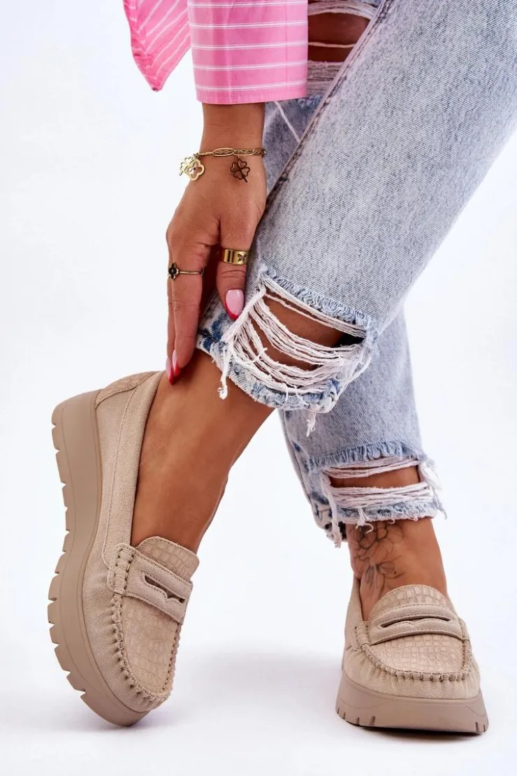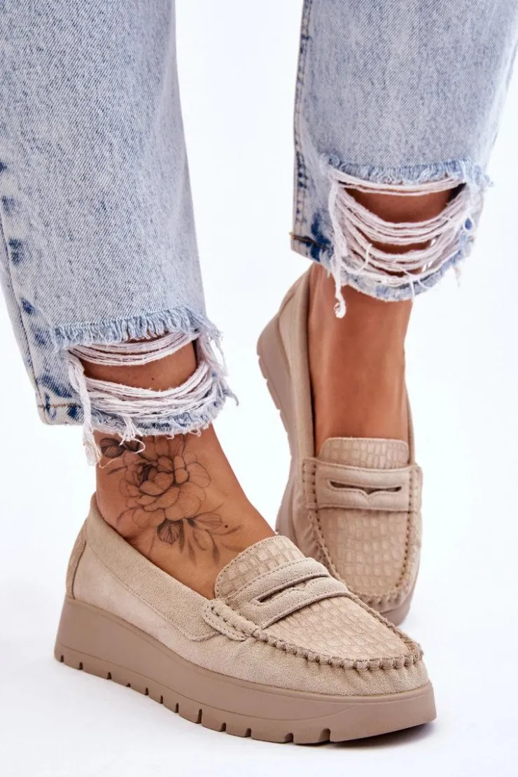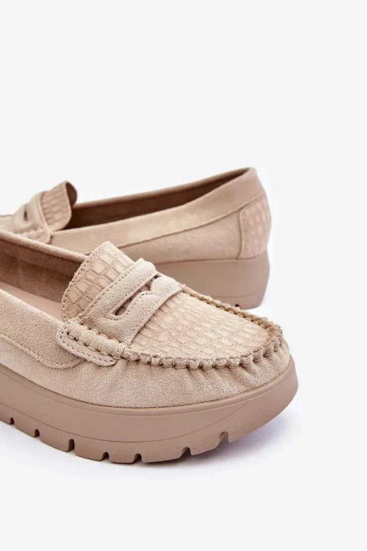 Mokasyny damskie wykonane z naturalnej skóry z ozdobnym paseczkiem z przodu. Zapiętek został usztywniony, co pozwoli na odpowiednią stabilizację stopy. Buty osadzono na platformie. Ten model posiada miękką wkładkę z perforacją. Mokasyny to idealne buty do wielu stylizacji! Koniecznie powinnaś je mieć! Przy wyborze rozmiaru prosimy sugerować się tabelą rozmiarów.