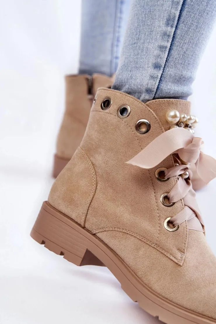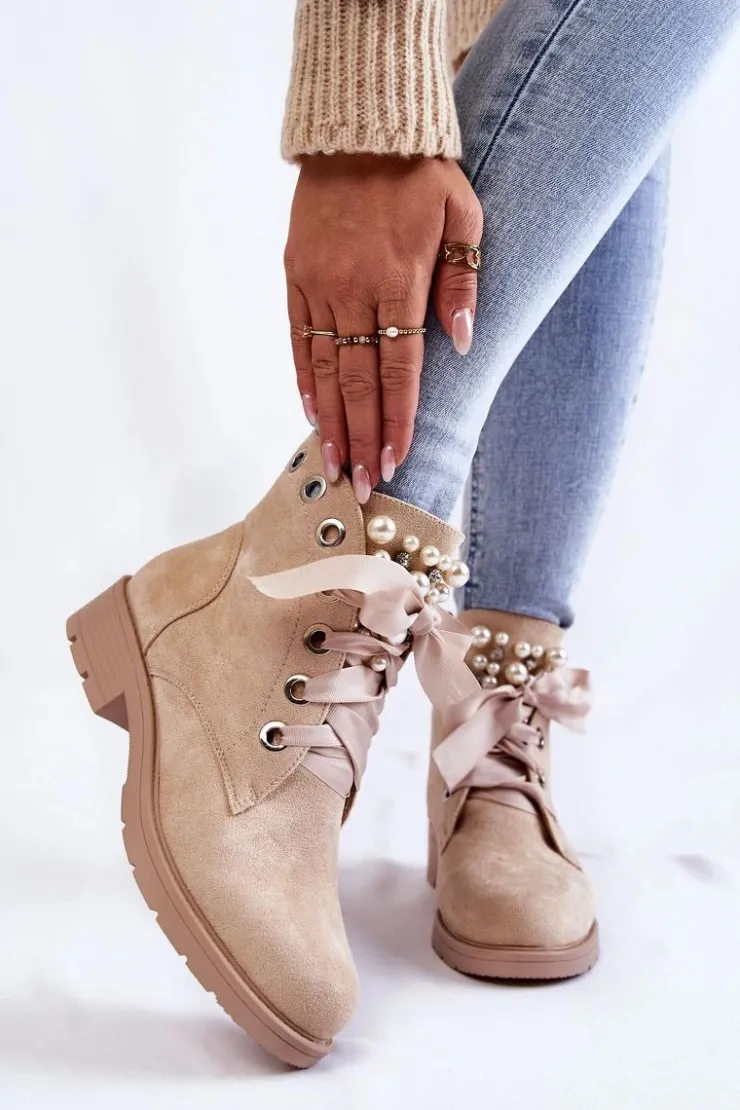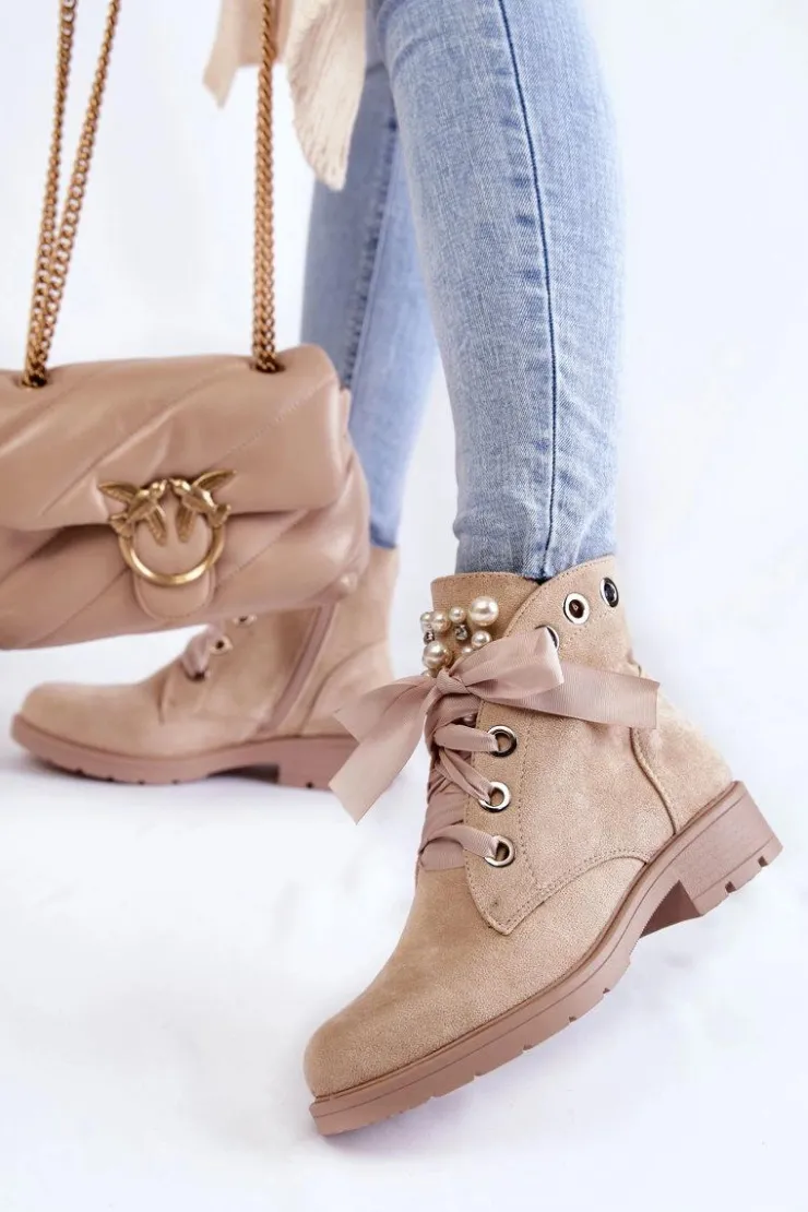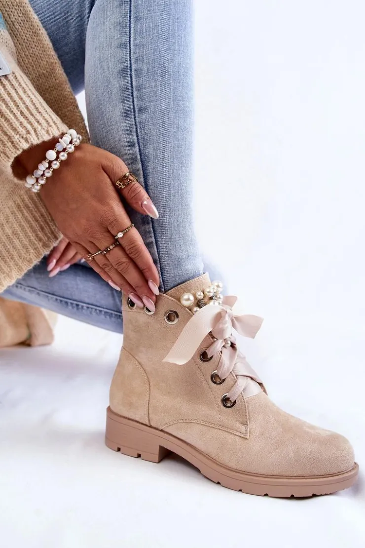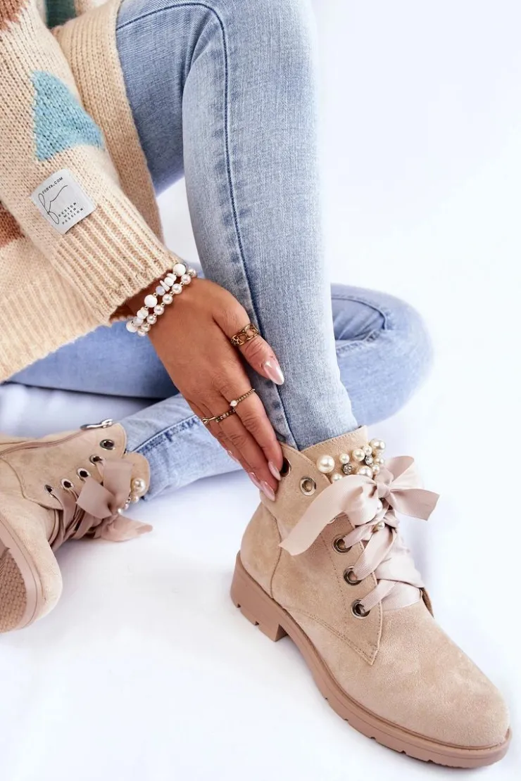 Damskie botki z pięknymi perełkami i dżetami imitującymi cyrkonie podkreślą każdą Twoją stylizację! Wykonane z eko skórzanych materiałów. Nieregularna cholewka została przyozdobiona metalowymi kółeczkami. Botki posiadają ocieplenie w postaci delikatnego koca obuwniczego. Osadzone na płaskim obcasie i delikatnej podeszwie. Ten świetny model nigdy nie wyjdzie z mody, dlatego powinnaś mieć te botki w swojej szafie! Przy wyborze rozmiaru prosimy sugerować się tabelą rozmiarów.