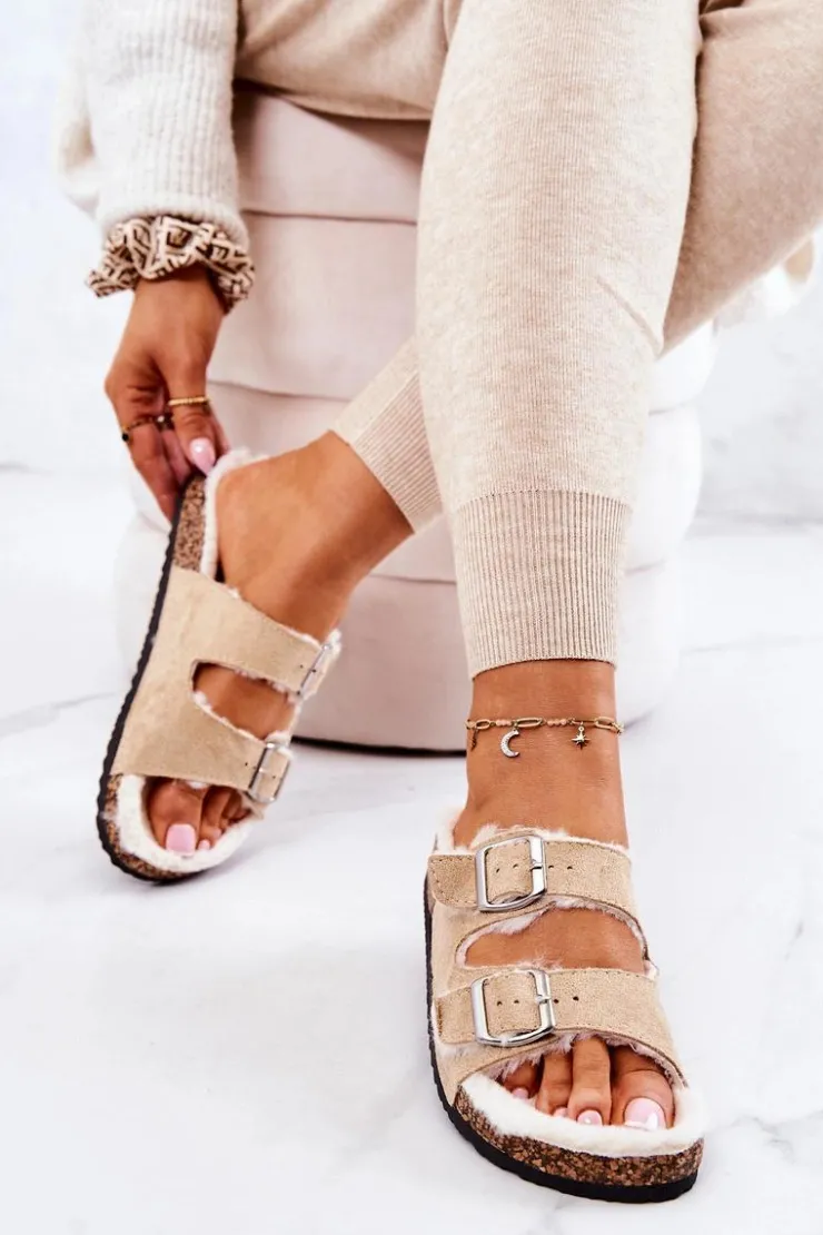 Damskie Boto Zamszowe Ocieplane Klapki Beżowe Adeline