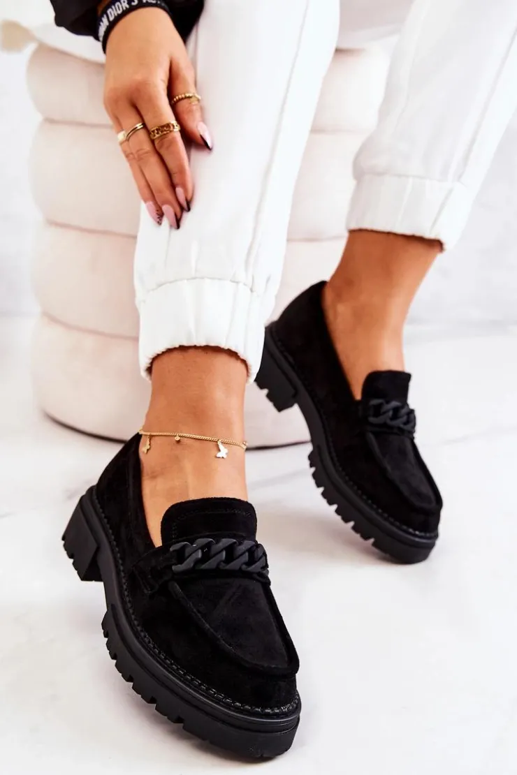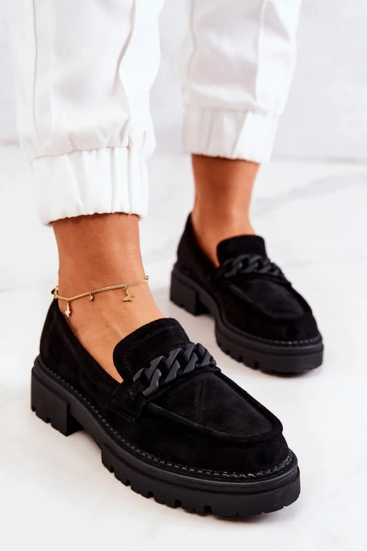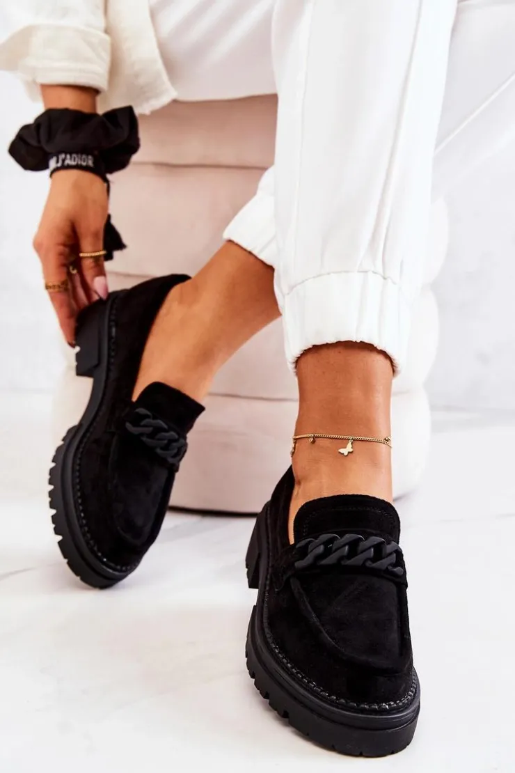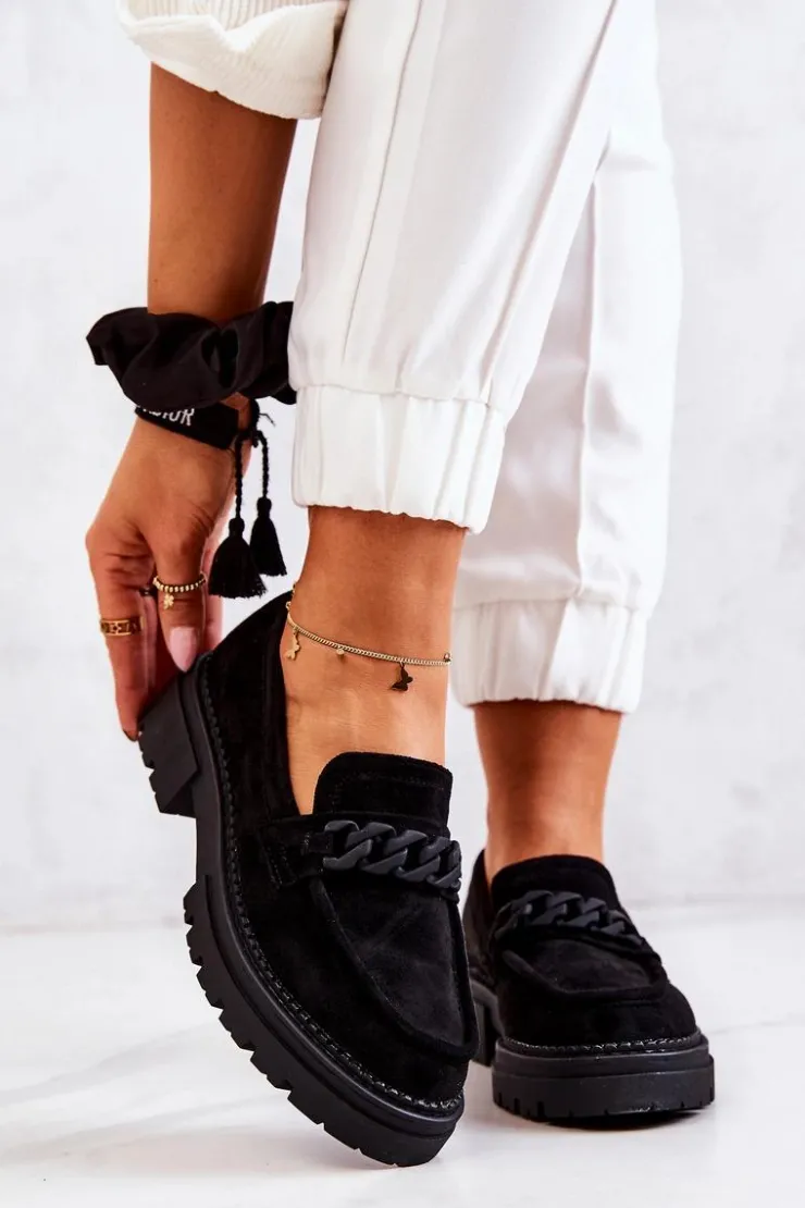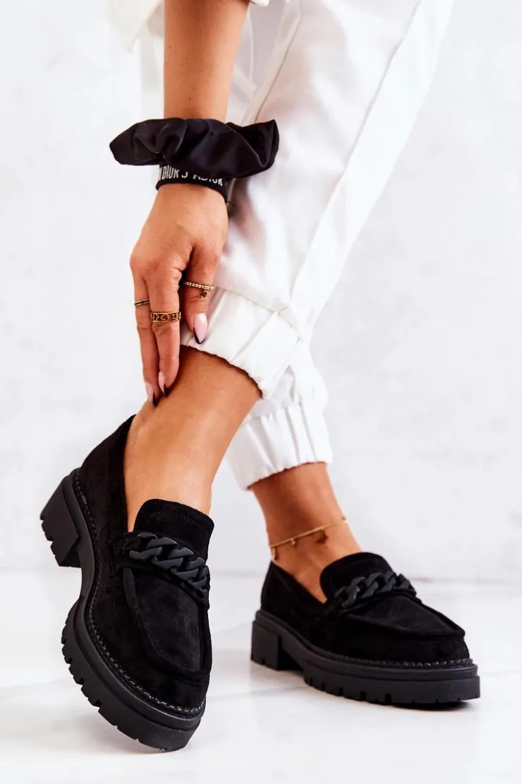 Klasyczne półbuty w stylu przepięknych loaferów marki Laura Fiore! Buty zostały wykonane z wysokiej jakości zamszowej eko skóry. Charakterystyczne zdobienie w postaci łańcucha sprawi, że stworzymy z nimi wiele wspaniałych stylizacji. Posiadają wysoką podeszwę oraz obcas, który uniesie naszą sylwetkę. Miękka wykonana z naturalnej skóry wkładka zadba o komfort podczas użytkowania obuwia. Przy wyborze rozmiaru prosimy sugerować się tabelą rozmiarów.