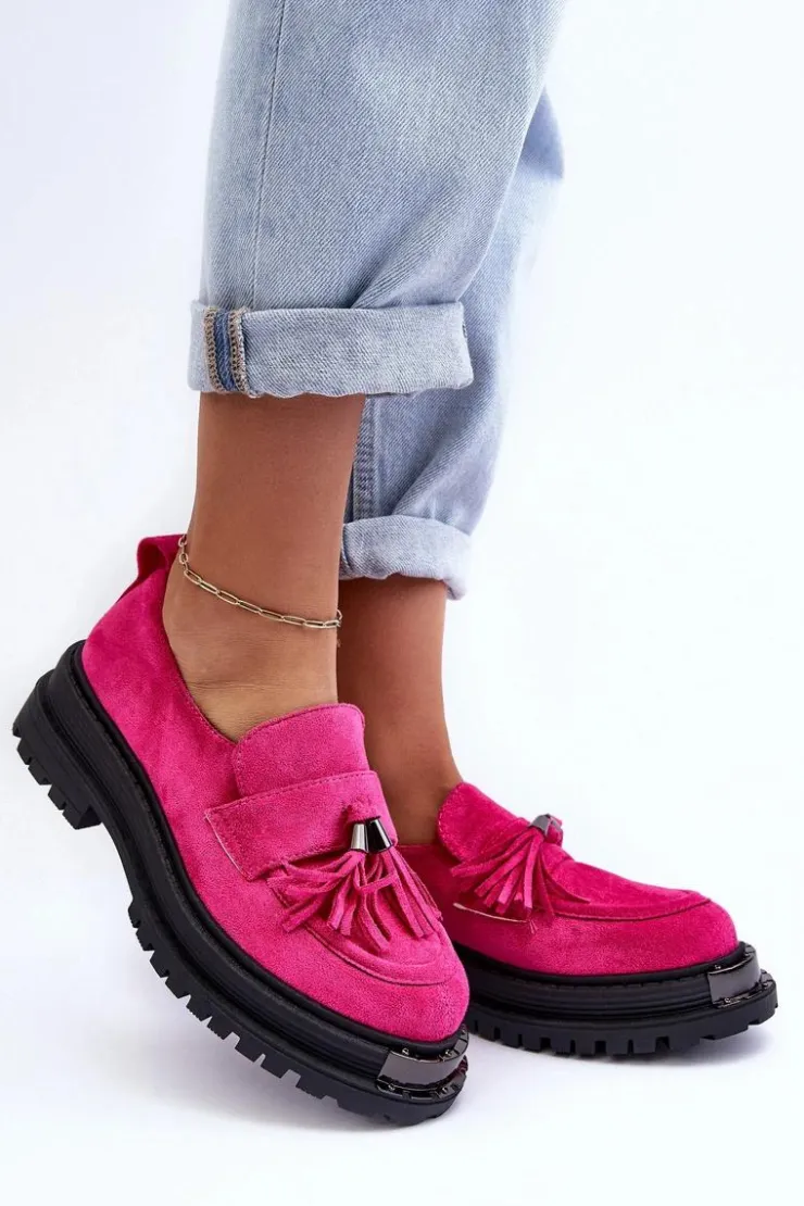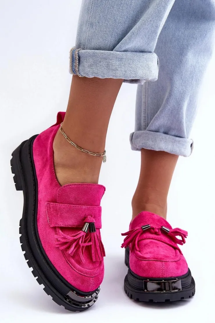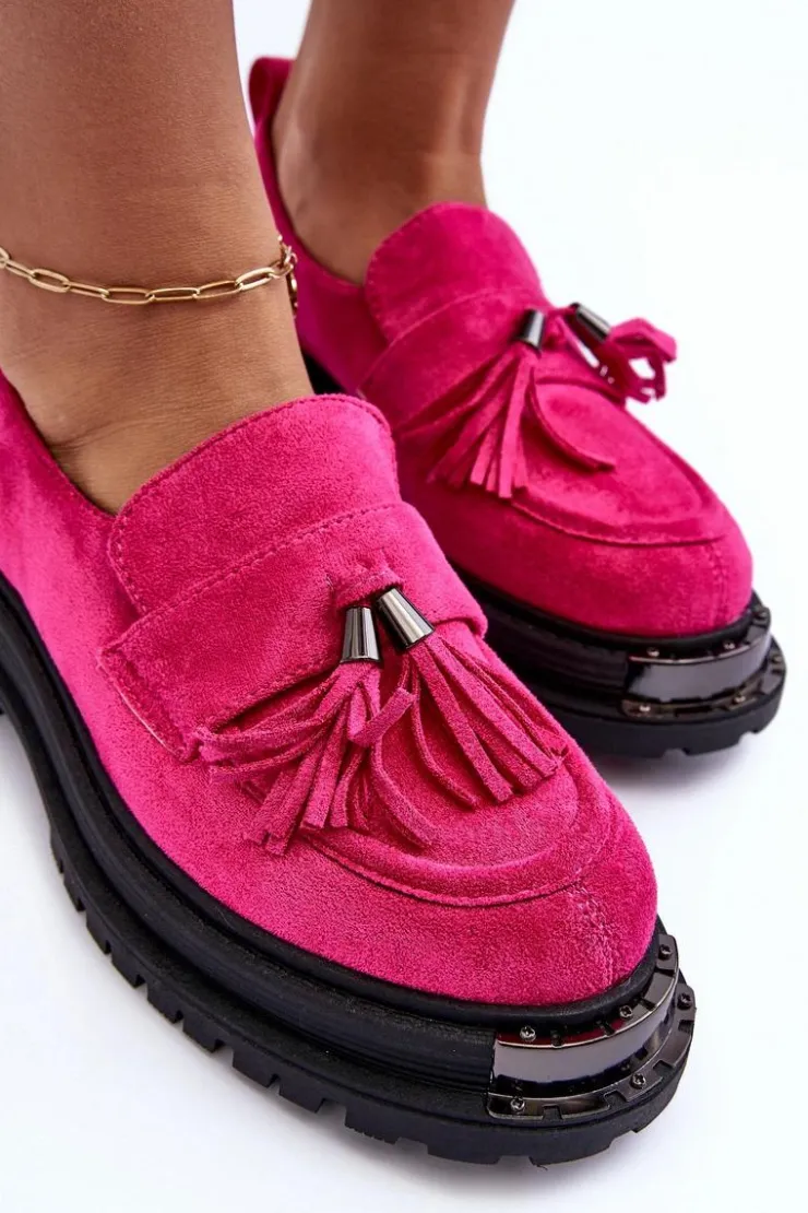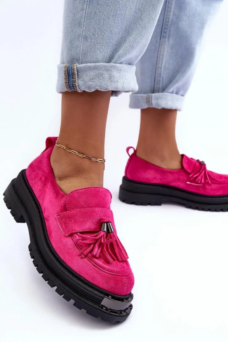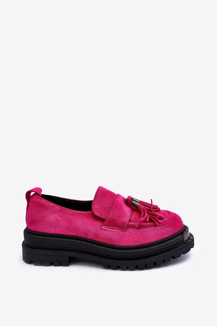 Damskie mokasyny to idealne obuwie na wiele okazji! Wykonane z eko zamszu. Osadzone na płaskim obcasie oraz platformie. Noski zaokrąglone. Przód ozdobiony paskiem z frędzlami. Miękka eko skórzana wkładka zapewni komfort podczas użytkowania. Dodatkowo zapiętek jest usztywniony. Ten model z pewnością przypadnie Ci do gustu! Przy wyborze rozmiaru prosimy sugerować się tabelą rozmiarów.