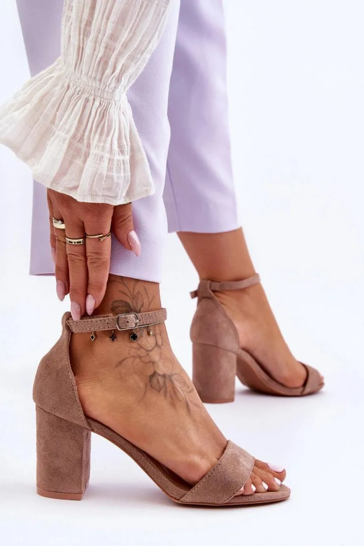 Klasyczne sandałki damskie osadzono na obcasie w postaci stabilnego słupka. Buty te zostały wykonane z eko zamszu. Nosek jest odkryty, zaokrąglony. Miękka wkładka z eko skóry zapewni komfort podczas użytkowania. Buty posiadają regulowany pasek zapinany na sprzączkę wokół kostki. Model ten wykorzystasz w wielu stylizacjach. Dodatkowo zapiętek został delikatnie usztywniony. Przy wyborze rozmiaru prosimy sugerować się tabelą rozmiarów.