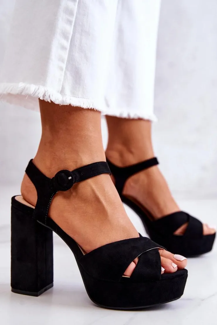 Świetne sandałki wykonane z zamszowej eko skóry. Posiadają wysoki obcas w postaci słupka oraz platformę. Regulowany pasek zapinany na sprzączkę. Idealny model na różnego rodzaju okazje! Sandałki posiadają eko skórzaną, miękką wkładkę. Koniecznie musisz je mieć! Przy wyborze rozmiaru prosimy kierować tabelą rozmiarów.