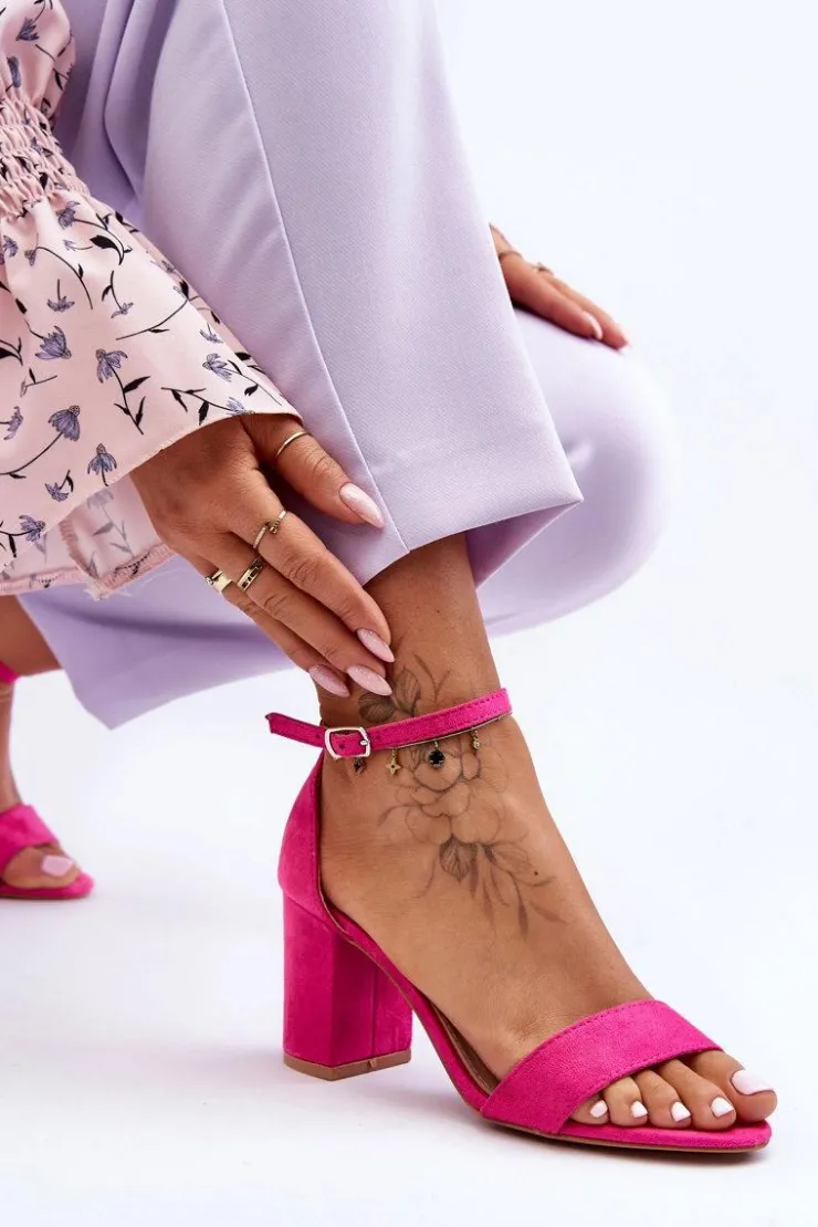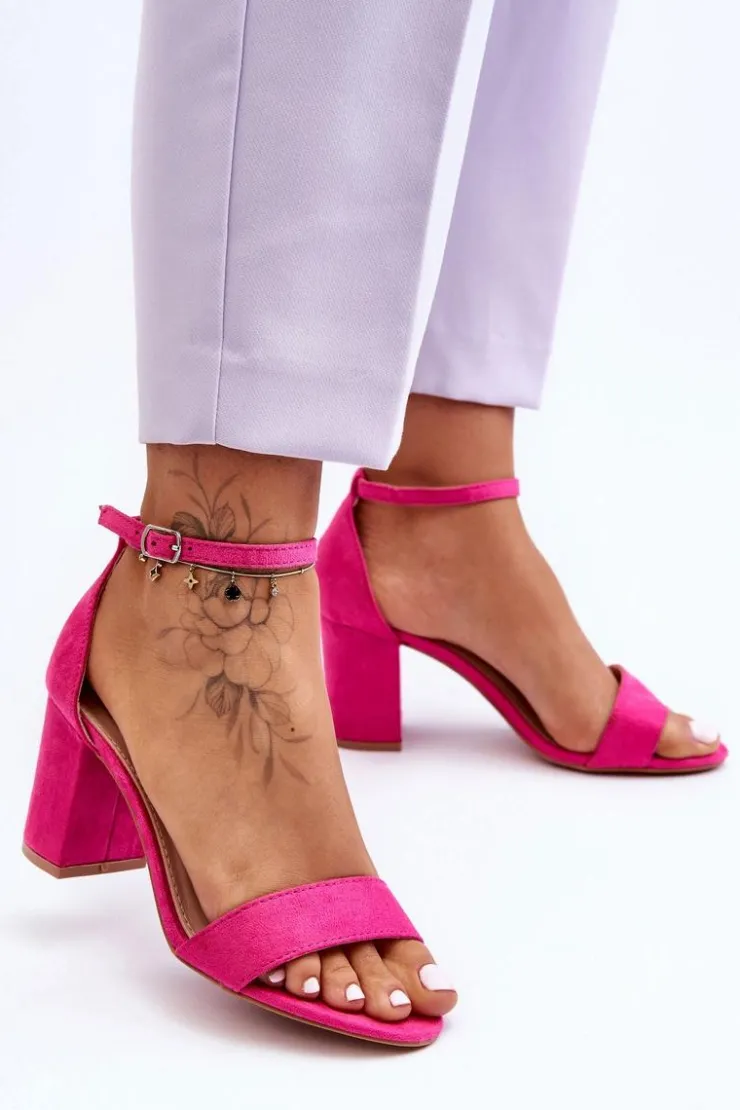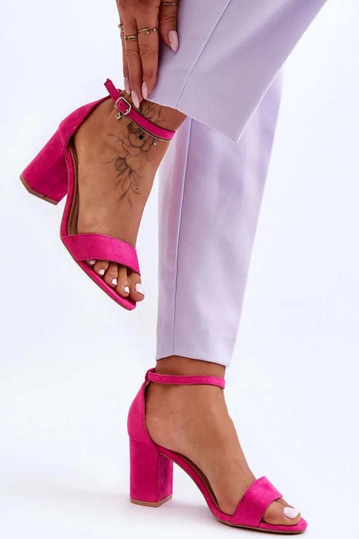 Klasyczne sandałki damskie osadzono na obcasie w postaci stabilnego słupka. Buty te zostały wykonane z eko zamszu. Nosek jest odkryty, zaokrąglony. Miękka wkładka z eko skóry zapewni komfort podczas użytkowania. Buty posiadają regulowany pasek zapinany na sprzączkę wokół kostki. Model ten wykorzystasz w wielu stylizacjach. Dodatkowo zapiętek został delikatnie usztywniony. Przy wyborze rozmiaru prosimy sugerować się tabelą rozmiarów.