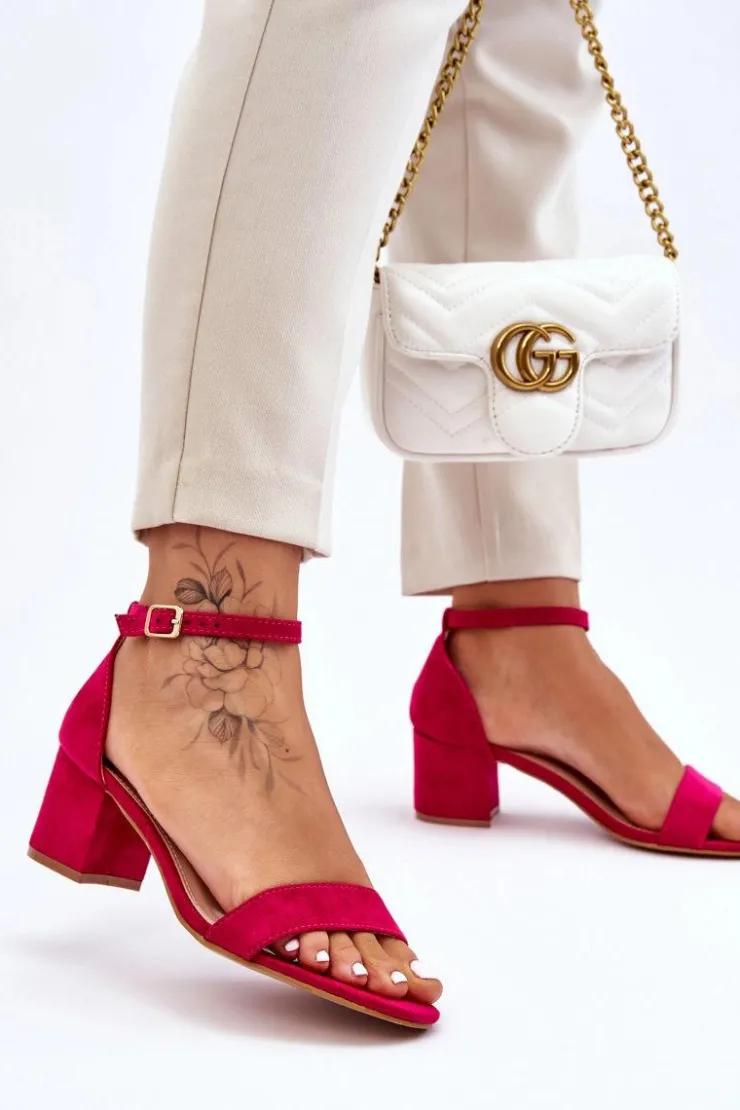 Wyjątkowe sandałki na niewysokim obcasie w postaci stabilnego słupka. Wykonane z przyjemnego w dotyku eko zamszu. Sandałki te posiadają usztywniany zapiętek. Wkładka wykonana z eko skóry zapewni komfortowe użytkowanie. Nosek odkryty, zaokrąglony. Zapinane wokół kostki na regulowany pasek ze sprzączką. Na pewno wykorzystasz je w wielu sytuacjach! Przy wyborze rozmiaru prosimy sugerować się tabelą rozmiarów.
