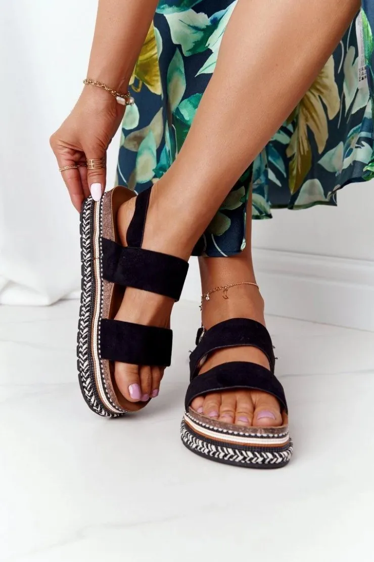 Wyjątkowe sandały na zdobionej platformie. Sandały zostały wykonane z eko zamszu, posiadają delikatnie profilowaną wkładkę. Wyjątkowy model wzbogaci Twoją letnią garderobę! Przy wyborze rozmiaru prosimy sugerować się tabelą rozmiarów.