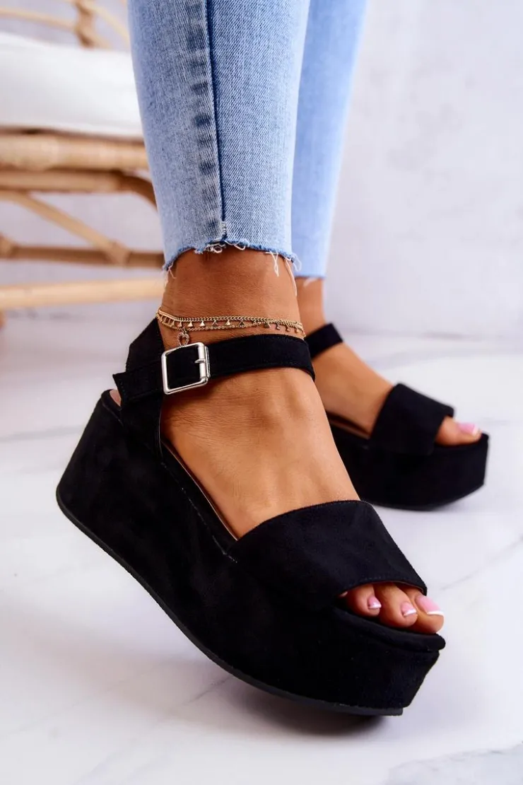 Piękne oraz wygodne sandały na koturnie wykonane z eko zamszu. Buty posiadają miękką wkładkę z eko skóry. Modny fason, idealny na lato! Stabilna, masywna platforma pozwoli na użytkowanie butów nawet przez cały dzień! Zapinane na regulowany pasek ze sprzączką. Możesz nosić je zarówno do zwiewnych, długich sukienek, jak i klasycznych szortów. Przy wyborze rozmiaru prosimy sugerować się tabelą rozmiarów.