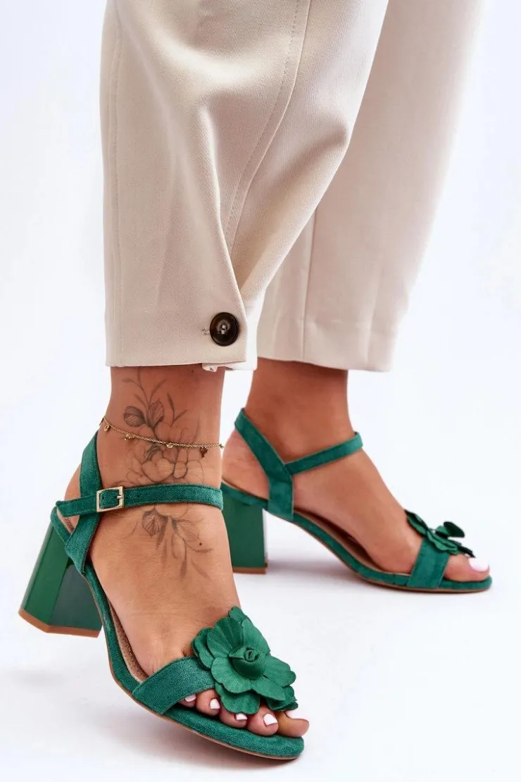 Cudowne, damskie sandałki zostały wykonane z eko zamszu. Model ten posiada na przednim pasku ozdobny kwiat. Sandałki są zapinane na regulowany pasek ze sprzączką. Miękka, a zarazem wygodna wykładka typu Comfort została wykonana z naturalnej skóry. Osadzono je na obcasie w postaci stabilnego słupka. Przy wyborze rozmiaru prosimy sugerować się tabelą rozmiarów.