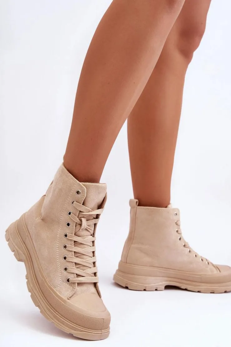 Modne, wysokie trampki damskie wykonane z eko zamszu. Model ten został osadzony na masywnej platformie. Buty posiadają klasyczne sznurowanie i zaokrąglony nosek. Modny fason sprawia, że możesz łączyć je w różnych stylizacjach. Koniecznie powinnaś je mieć! Przy wyborze rozmiaru prosimy sugerować się tabelą rozmiarów.