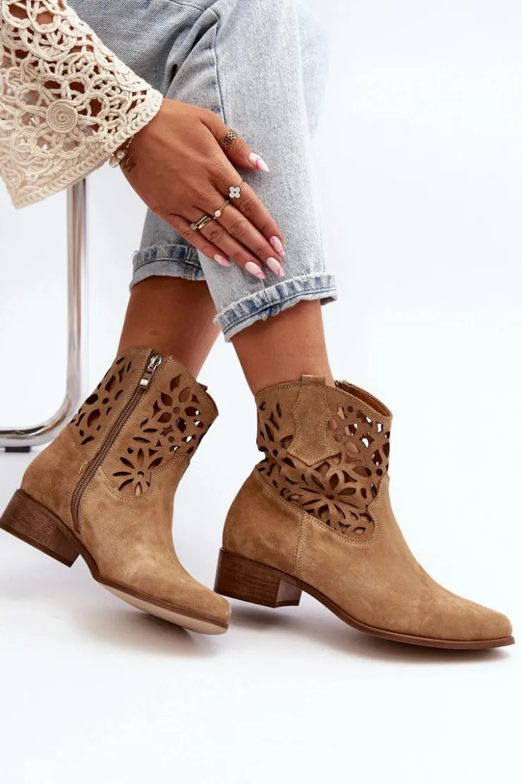 Botki damskie wykonane z naturalnego zamszu. Osadzone na niskim obcasie, co sprawia, że są zarówno stylowe, jak i wygodne. Ażurowy wzorek na cholewce dodaje im elegancji. Model ten zapiany jest na zamek, co ułatwia zakładanie obuwia. Miękka wkładka gwarantuje komfort noszenia. Przy wyborze rozmiaru prosimy sugerować się tabelą rozmiarów.