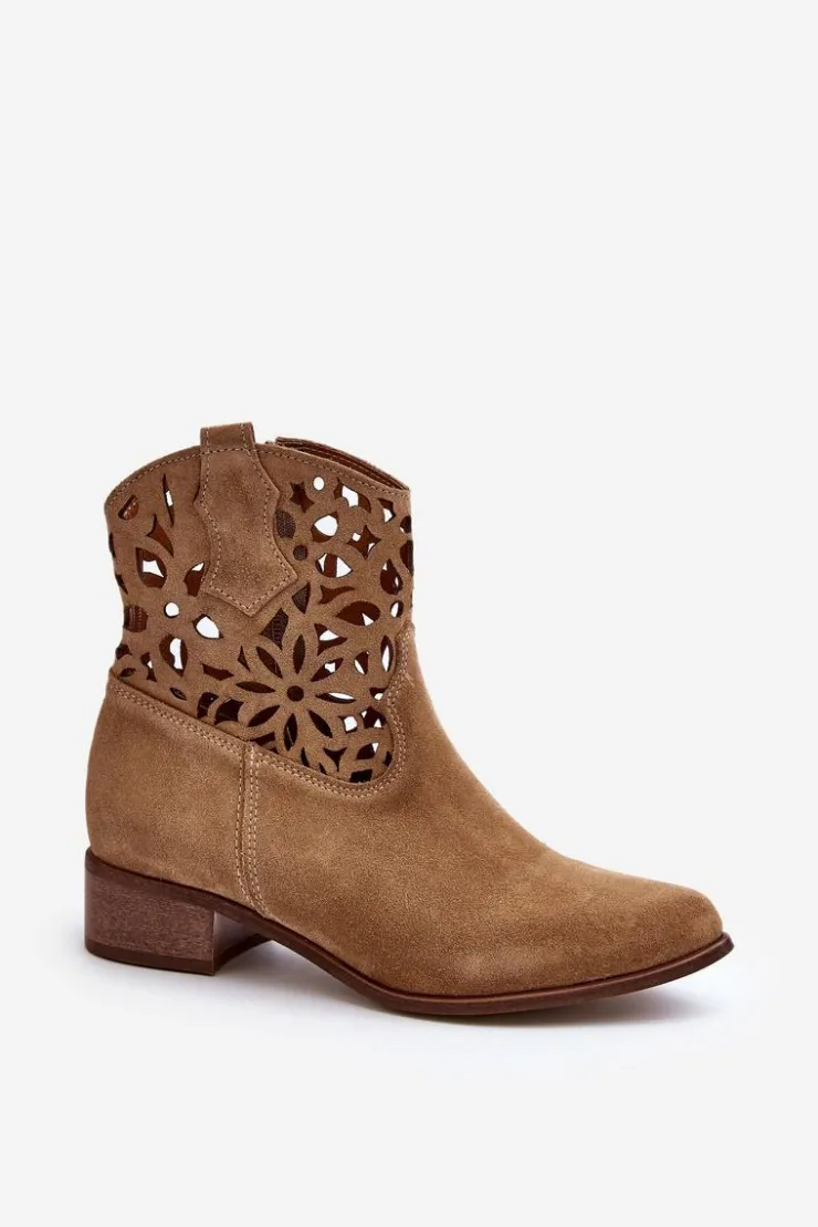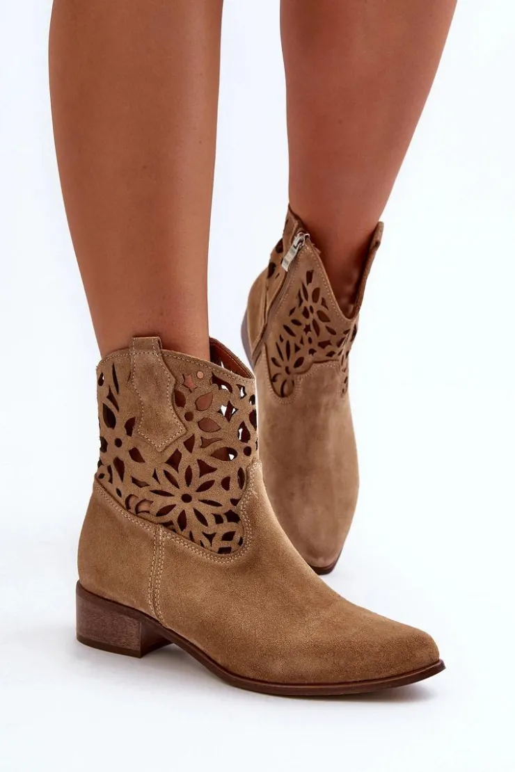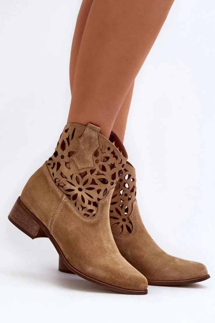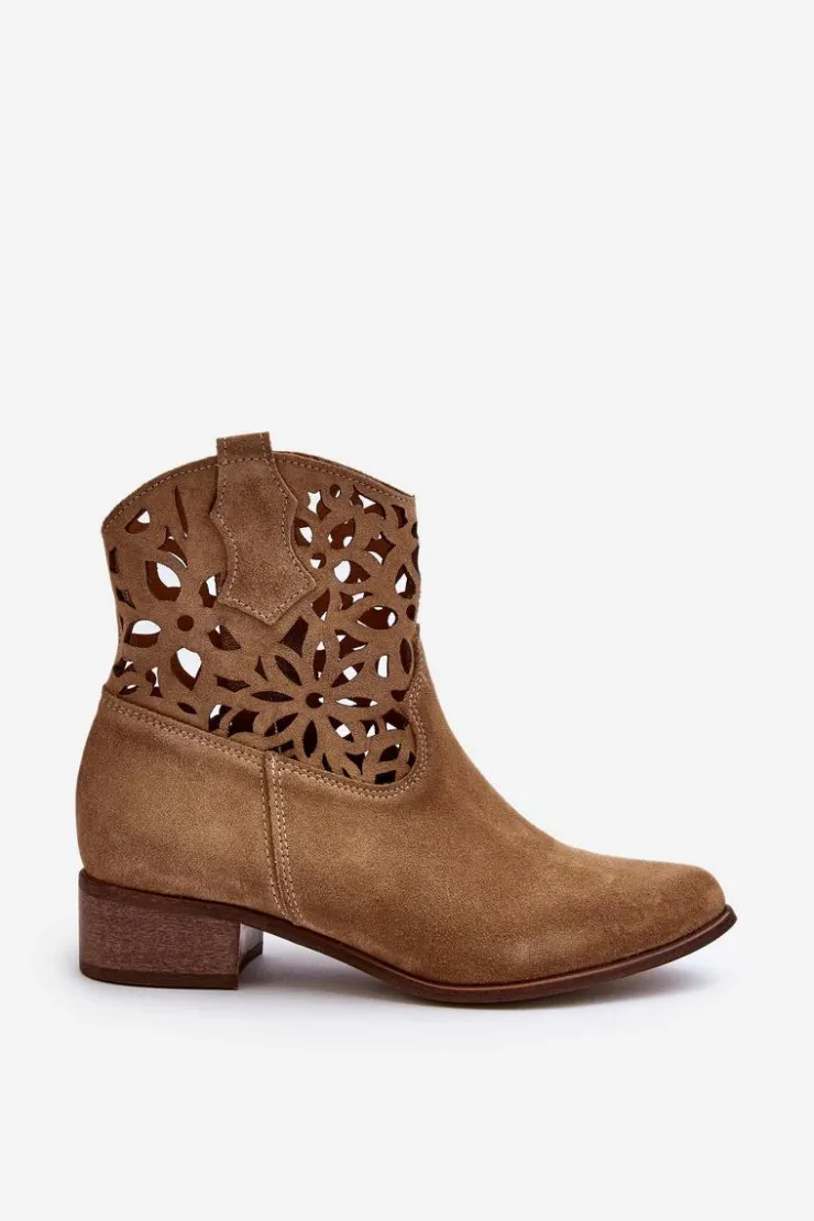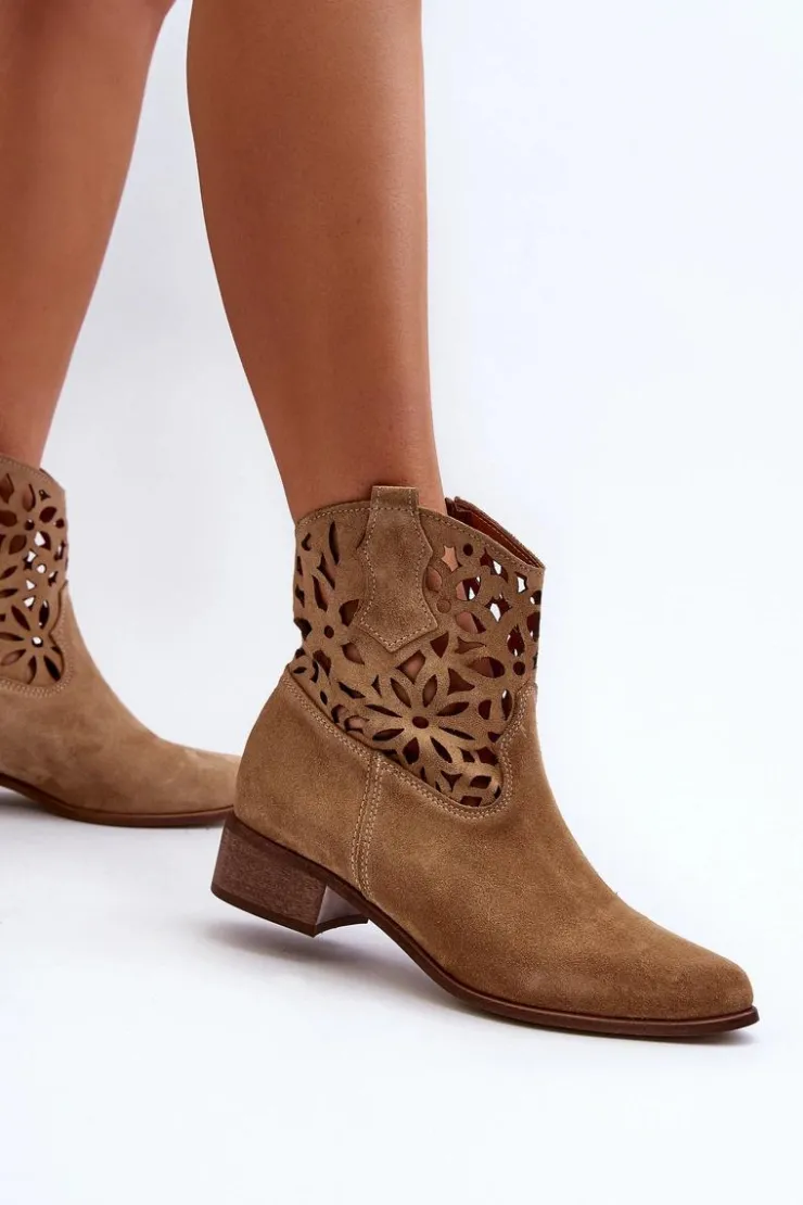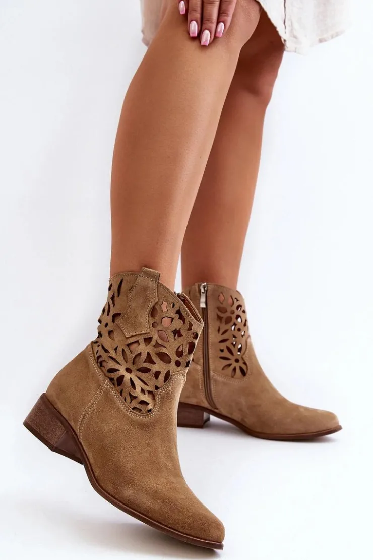 Botki damskie wykonane z naturalnego zamszu. Osadzone na niskim obcasie, co sprawia, że są zarówno stylowe, jak i wygodne. Ażurowy wzorek na cholewce dodaje im elegancji. Model ten zapiany jest na zamek, co ułatwia zakładanie obuwia. Miękka wkładka gwarantuje komfort noszenia. Przy wyborze rozmiaru prosimy sugerować się tabelą rozmiarów.