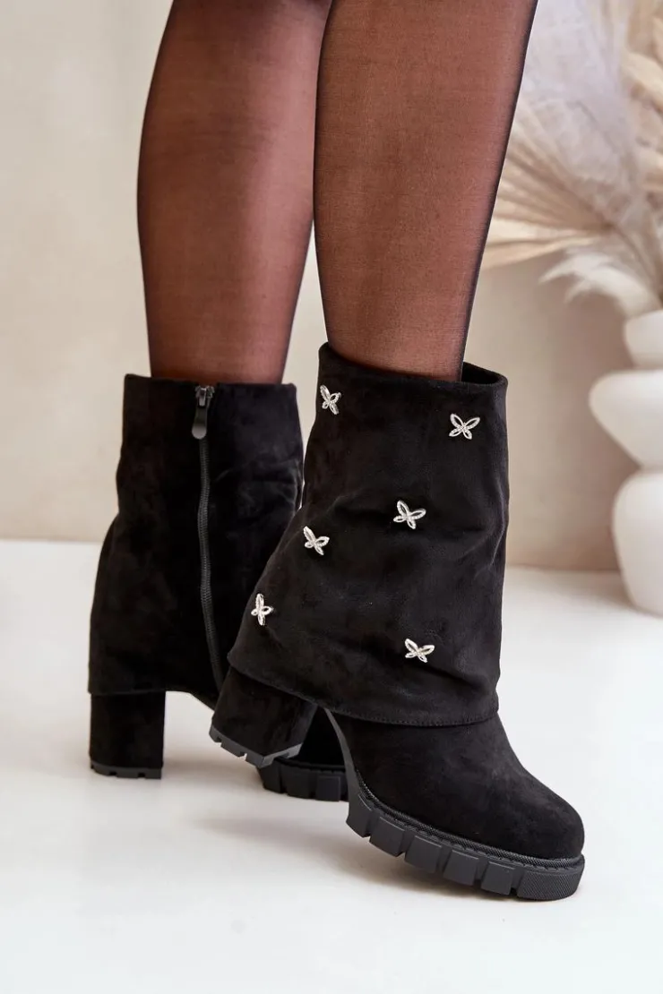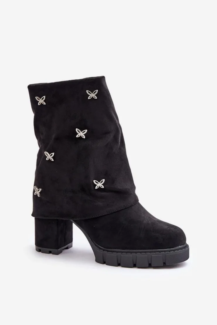 Botki damskie wykonane z eko zamszu. Model wyróżnia się zdobioną, wywiniętą cholewką, która zachodzi na stabilny obcas słupek, dodając im elegancji i nowoczesnego stylu. Zapinane na zamek, z ocieplanym wnętrzem, zapewniają wygodę i ciepło. Świetny wybór do stylizacji na sezon jesienno-zimowy. Przy wyborze rozmiaru prosimy sugerować się tabelą rozmiarów.