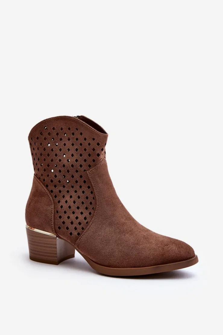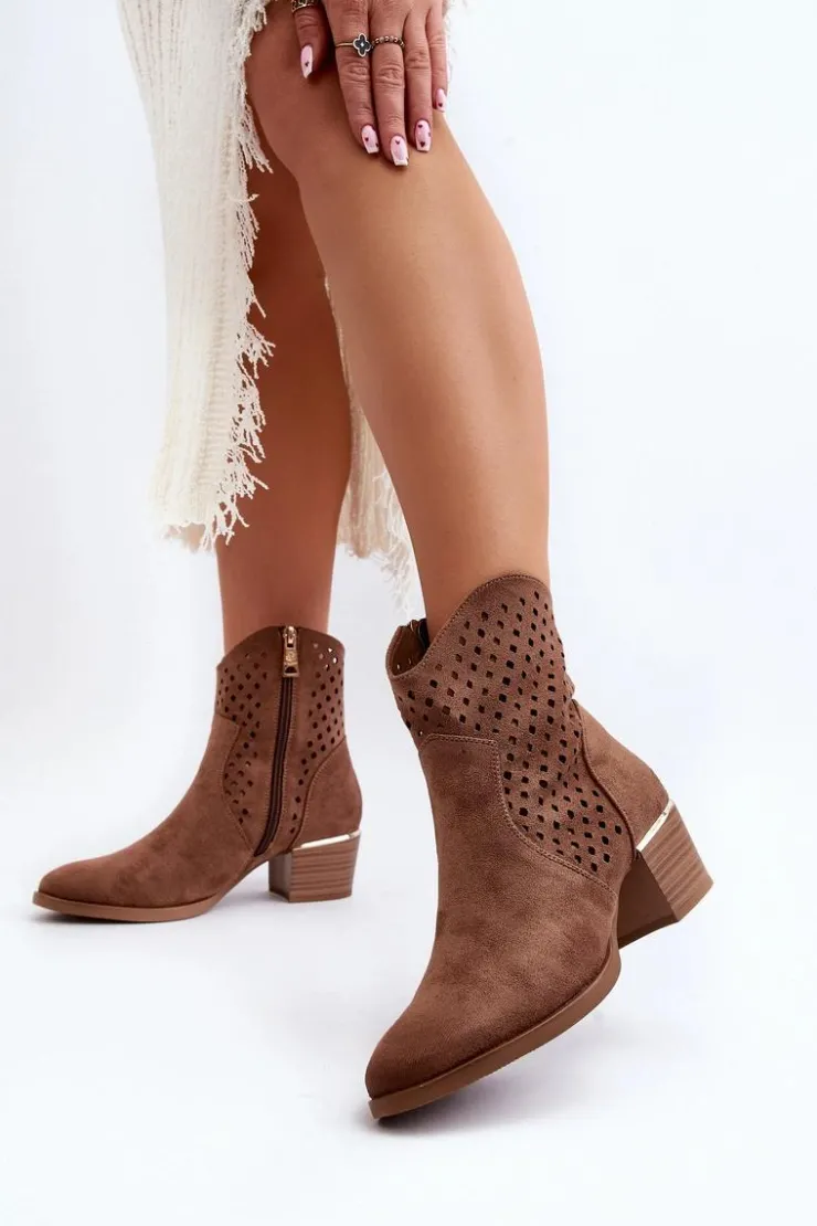 Z tymi botkami idealnie przygotujesz się na nadchodzący sezon! Eko zamszowa cholewka w ażurowy wzorek charakteryzuje ten model. Niski obcas zapewni stabilność na każdym kroku. Model ten zapinany jest na zamek. Noski w migdał. Fason ten idealnie dopełni wiosenne stylizacje! Przy wyborze rozmiaru prosimy sugerować się tabelą rozmiarów.