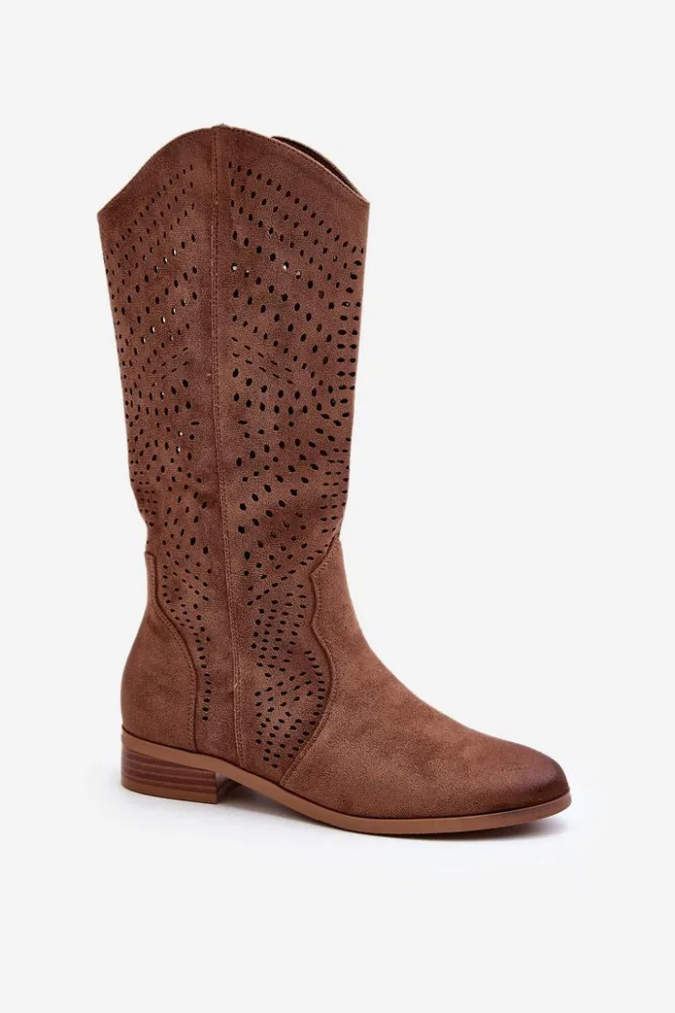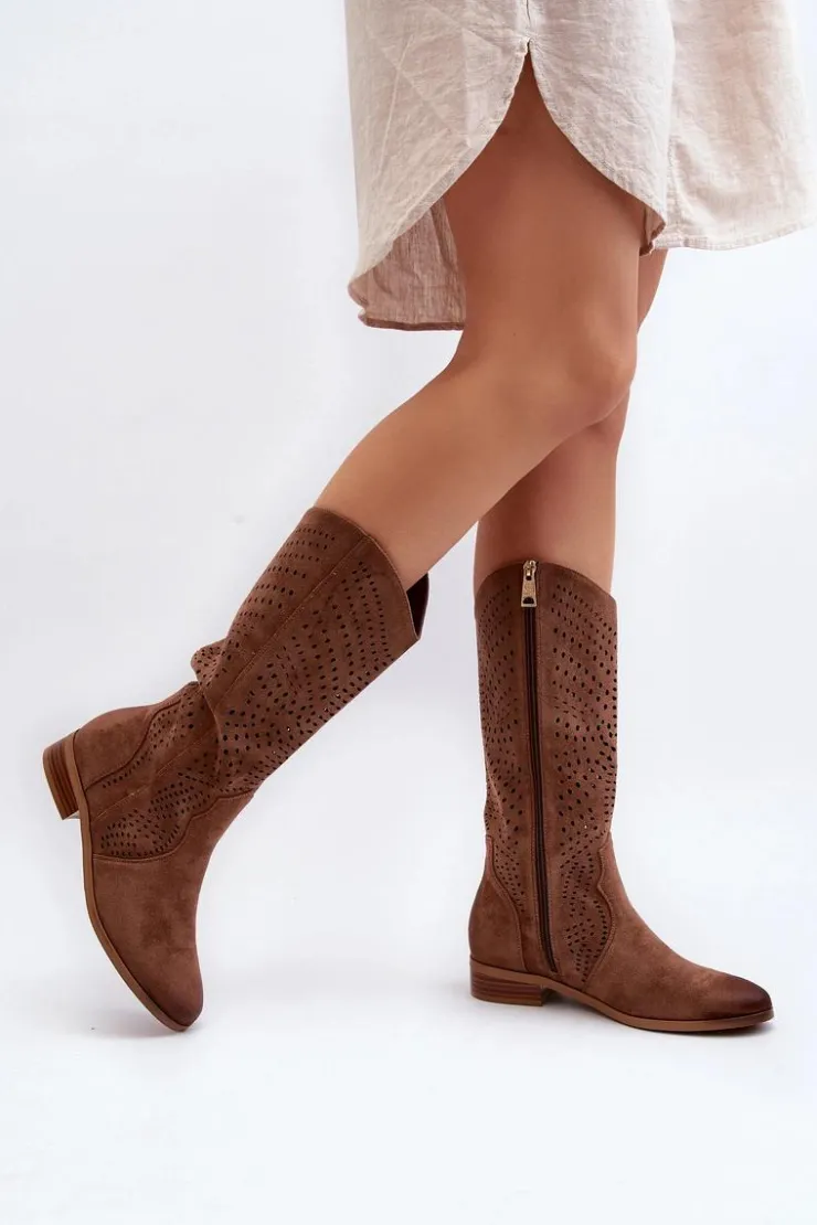Kozaki damskie z ażurową cholewką idealnie dopełnią wiosenne stylizacje. Wykonane z eko zamszu. Osadzone na płaskim, stabilnym obcasie. Noski zaokrąglone. Model ten zapinany jest na zamek. Wkładka wykonana ze skóry naturalnej. Koniecznie musisz je mieć! Przy wyborze rozmiaru prosimy sugerować się tabelą rozmiarów.