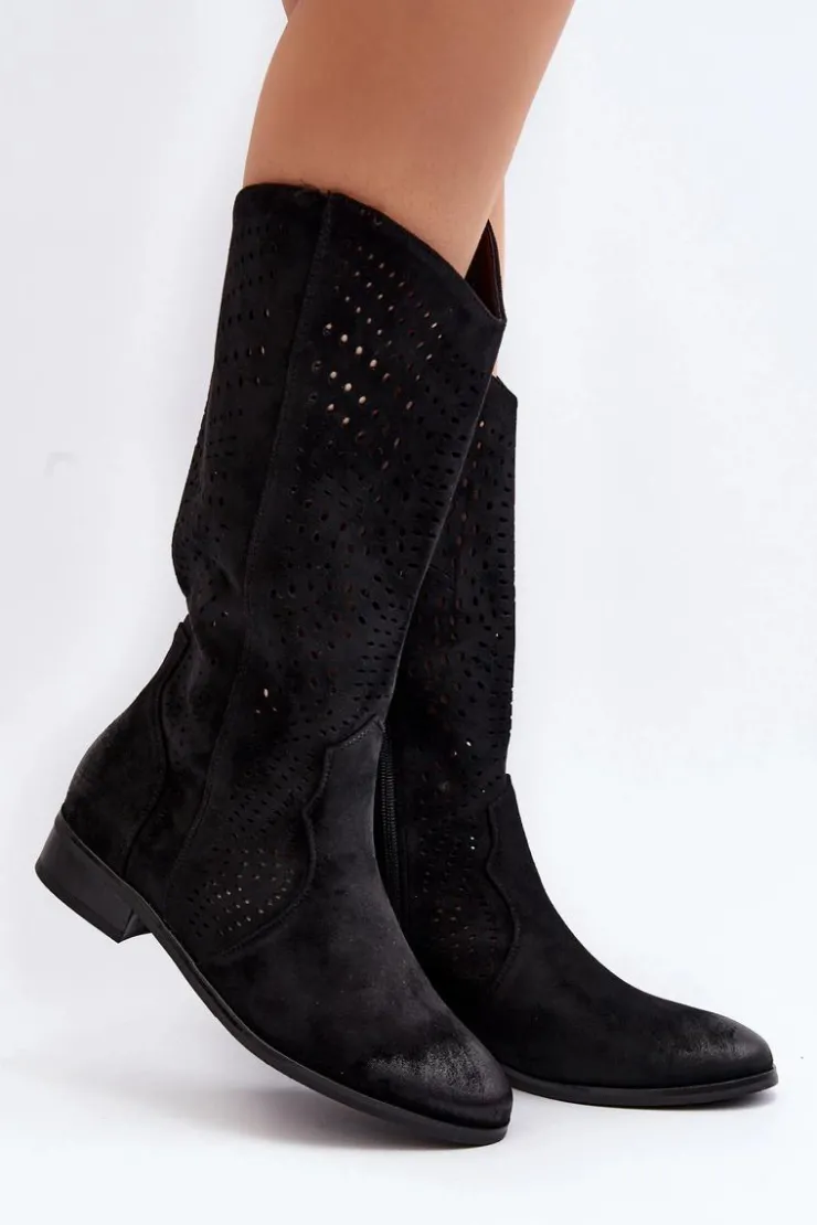 Kozaki damskie z ażurową cholewką idealnie dopełnią wiosenne stylizacje. Wykonane z eko zamszu. Osadzone na płaskim, stabilnym obcasie. Noski zaokrąglone. Model ten zapinany jest na zamek. Wkładka wykonana ze skóry naturalnej. Koniecznie musisz je mieć! Przy wyborze rozmiaru prosimy sugerować się tabelą rozmiarów.