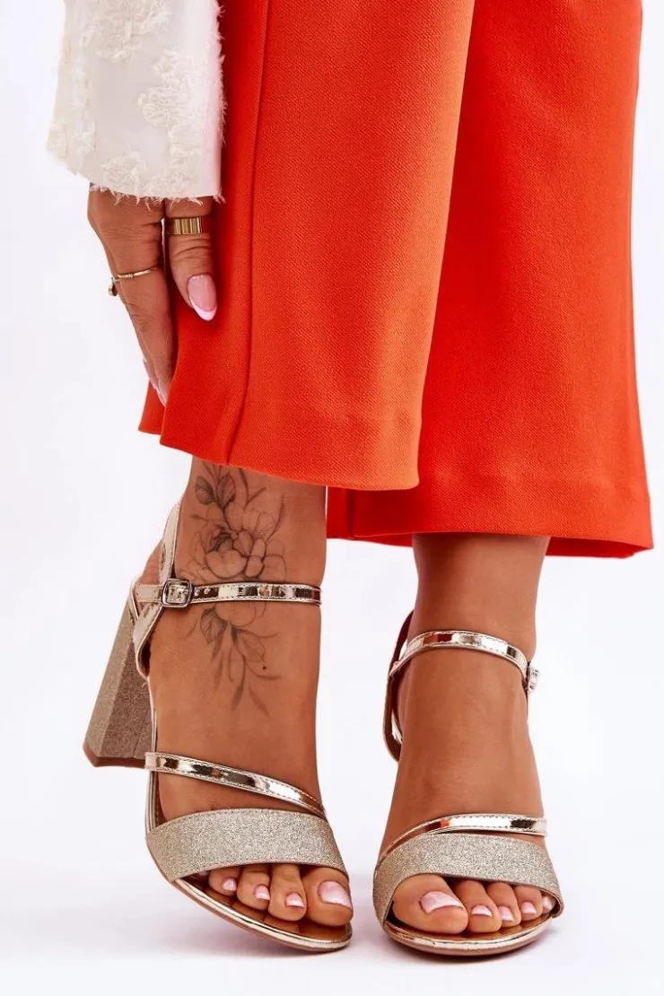 Piękne sandały na obcasie w postaci słupka. Buty te zostały wykonane z eko skóry. Dodatkowo paseczek z przodu oraz obcas są brokatowe, przez co buty wyglądają naprawdę elegancko. Miękka wkładka z eko skóry zapewni komfort podczas użytkowania. Buty posiadają regulowany pasek zapinany na sprzączkę wokół kostki. Model ten wykorzystasz podczas wielu uroczystości rodzinnych, imprez ze znajomymi czy biznesowych spotkań. Przy wyborze rozmiaru prosimy sugerować się tabelą rozmiarów.