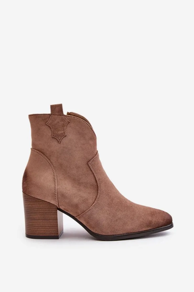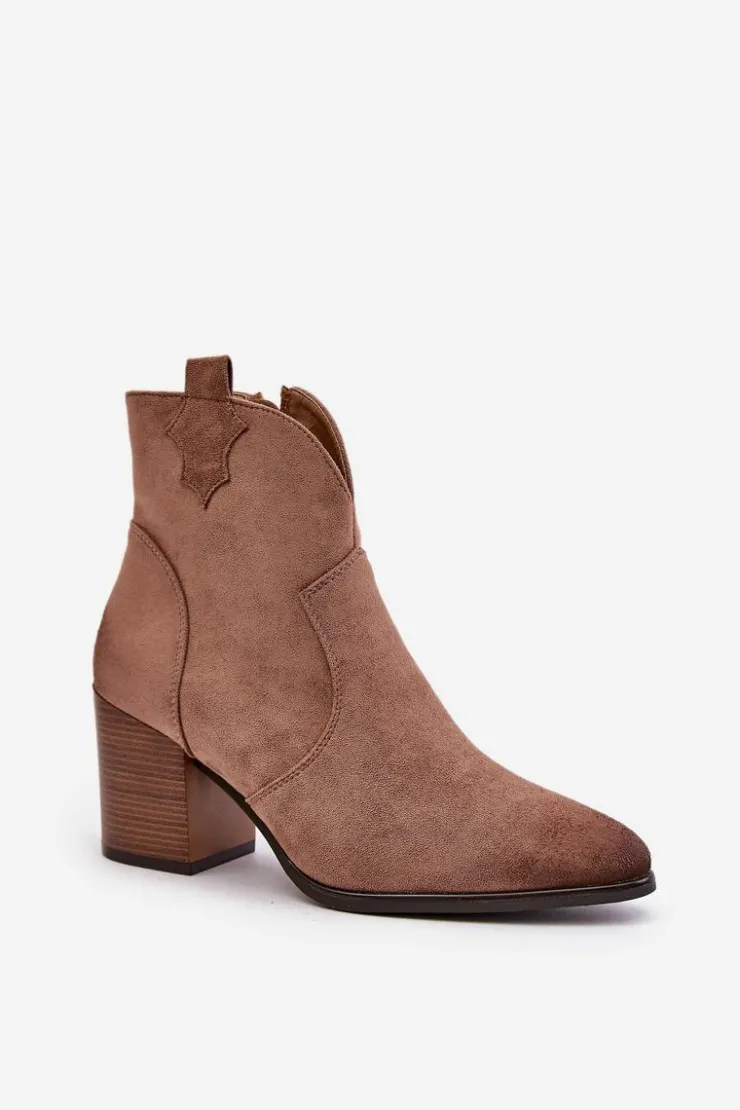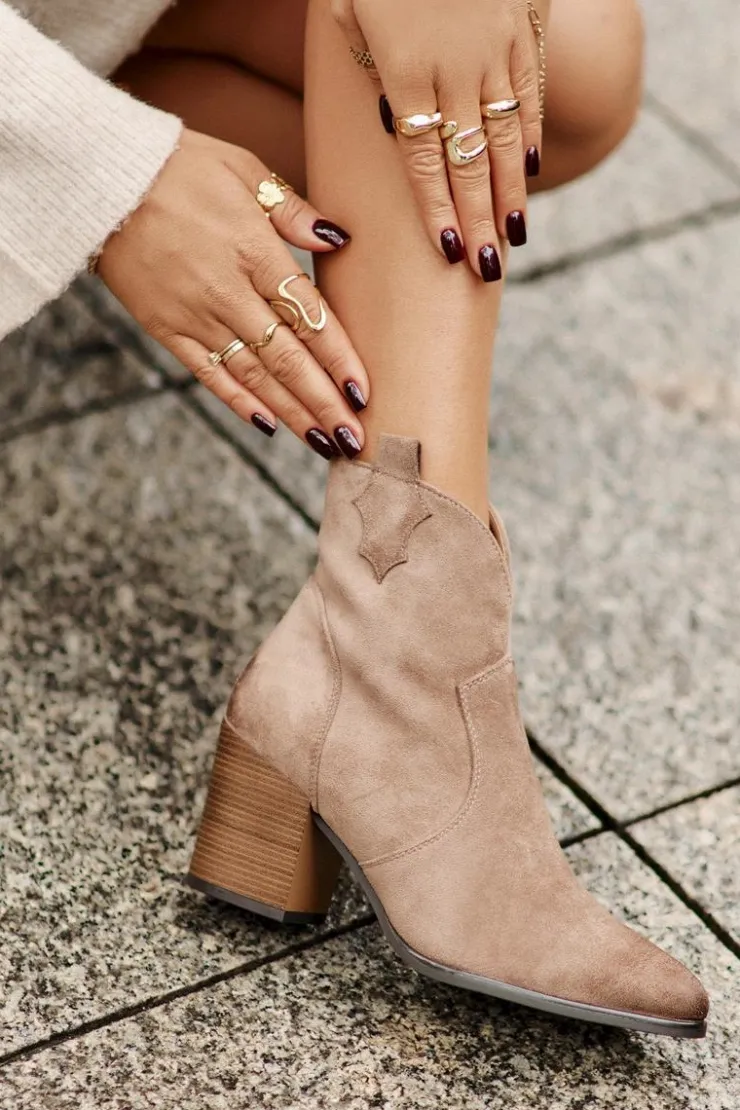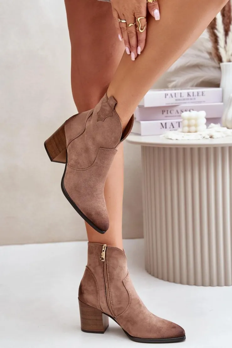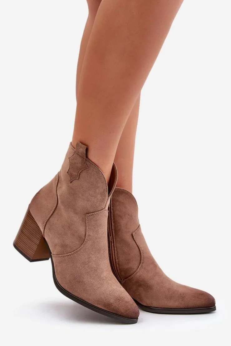 Botki kowbojki wykonane z eko zamszu to modna propozycja na chłodniejsze dni, łącząca styl westernowy z elegancją. Osadzone na obcasie typu słupek, zapewniają wygodę i subtelne podwyższenie. Model wyróżnia się szpiczastymi, przecieranymi noskami, które dodają im charakteru. Zapinane na zamek dla łatwego zakładania, a wnętrze ocieplone filcem gwarantuje komfort termiczny. Te kowbojki to idealny wybór dla osób ceniących oryginalny styl i wygodę. Przy wyborze rozmiaru prosimy sugerować się tabelą rozmiarów.